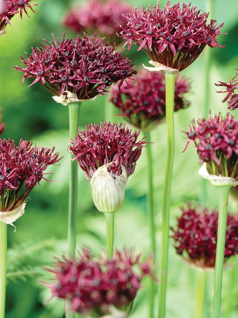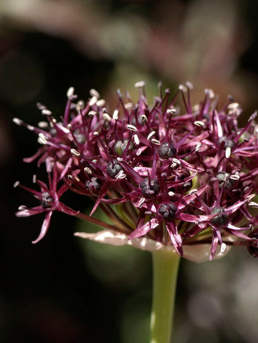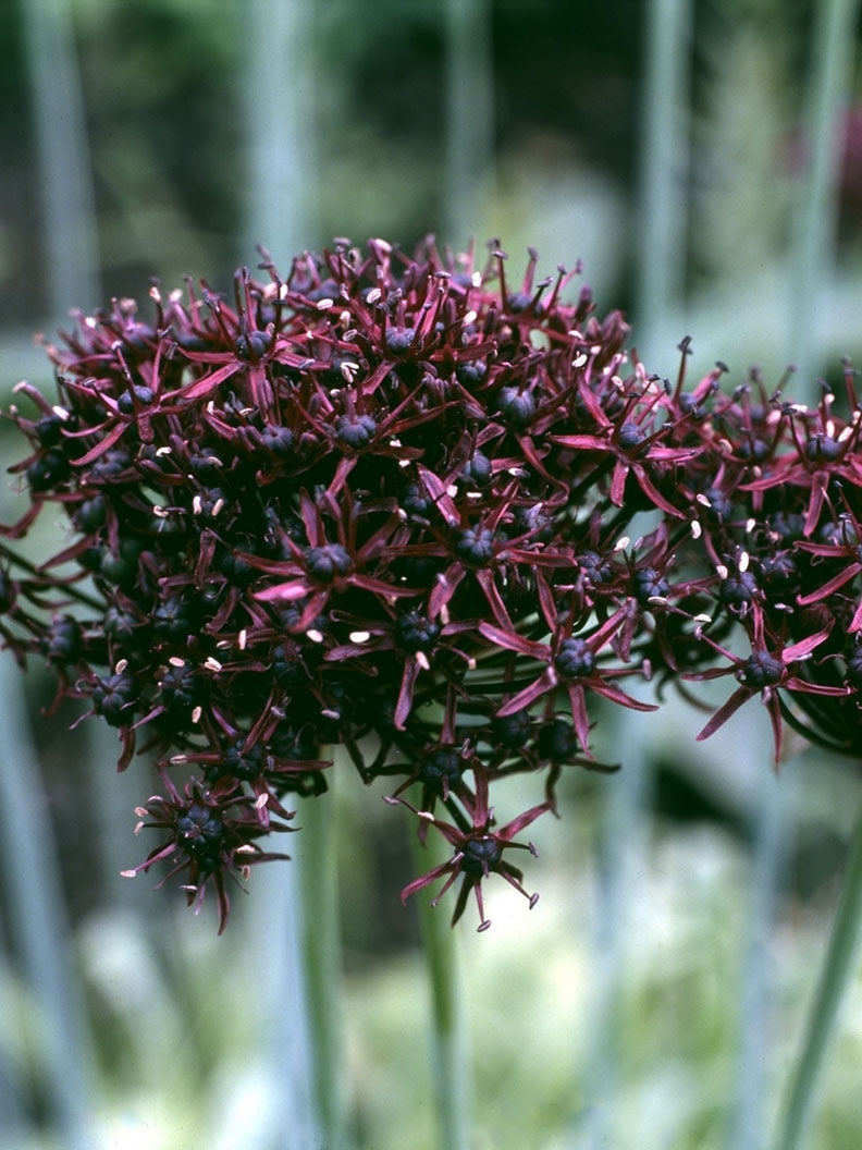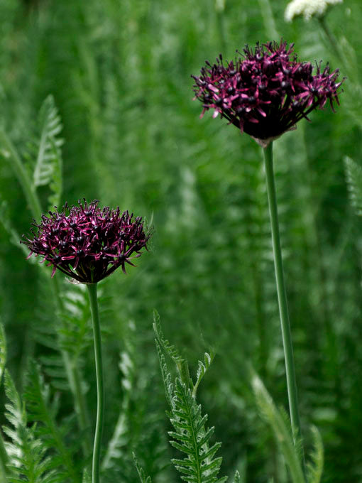 Vinlök, Allium atropurpureum, är en av de vackraste alliumsorterna med mörkt, rubinskimrande vinröda bollar på vajande stjälkar. Den blir helt underbar placerad i motljus där blommorna skimrar som juveler. Den blir cirka 80 cm hög och blommar i juni-juli.