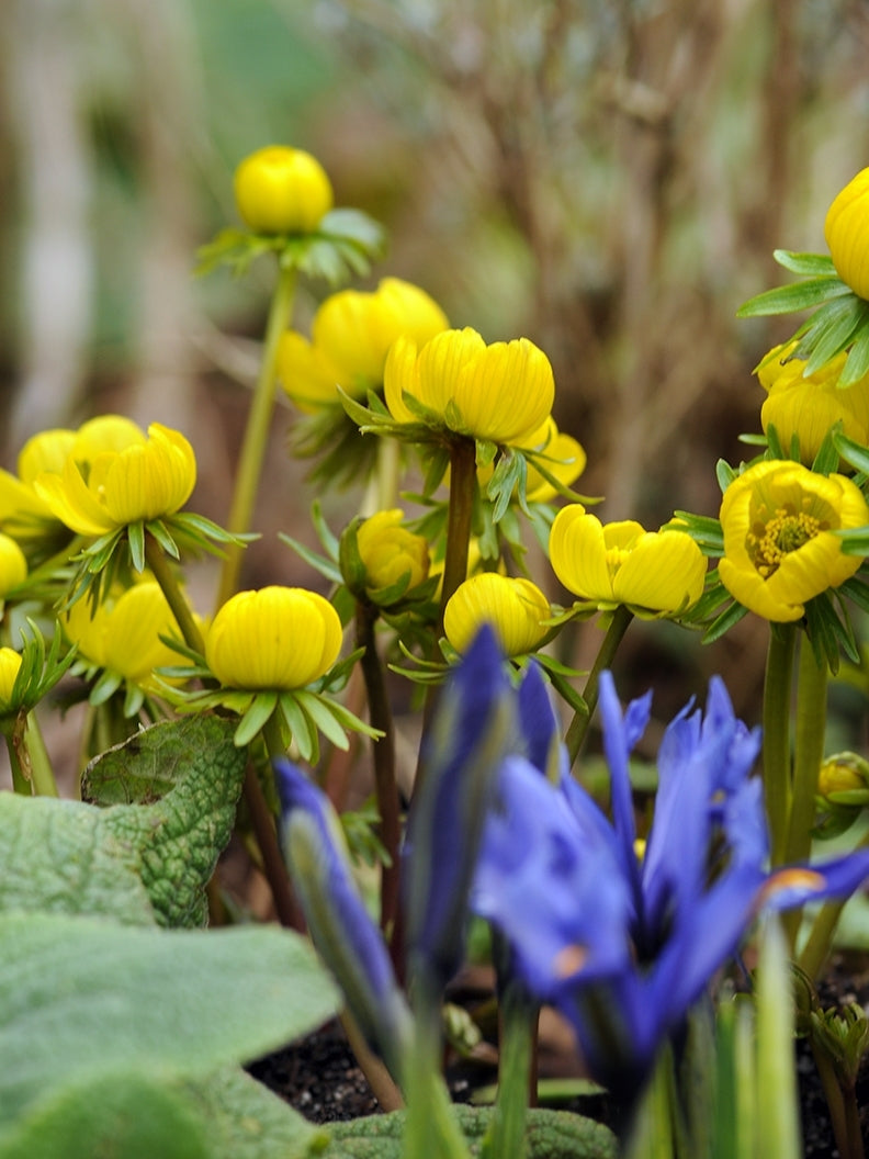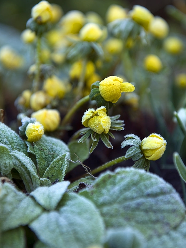 Vintergäck Eranthis hyemalis. En mycket tidigt blommande klassiker som sprider sig villigt i sol till halvskugga. Täta stödblad sitter under den gula skålformade blomman. Blir 5-10 cm hög. Förvildad i Sverige sedan sent 1800-tal. Kallades förr även Vinternarr.