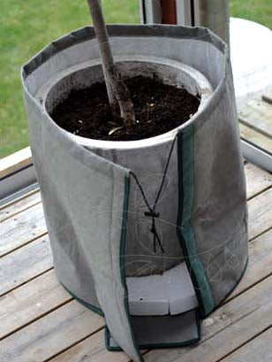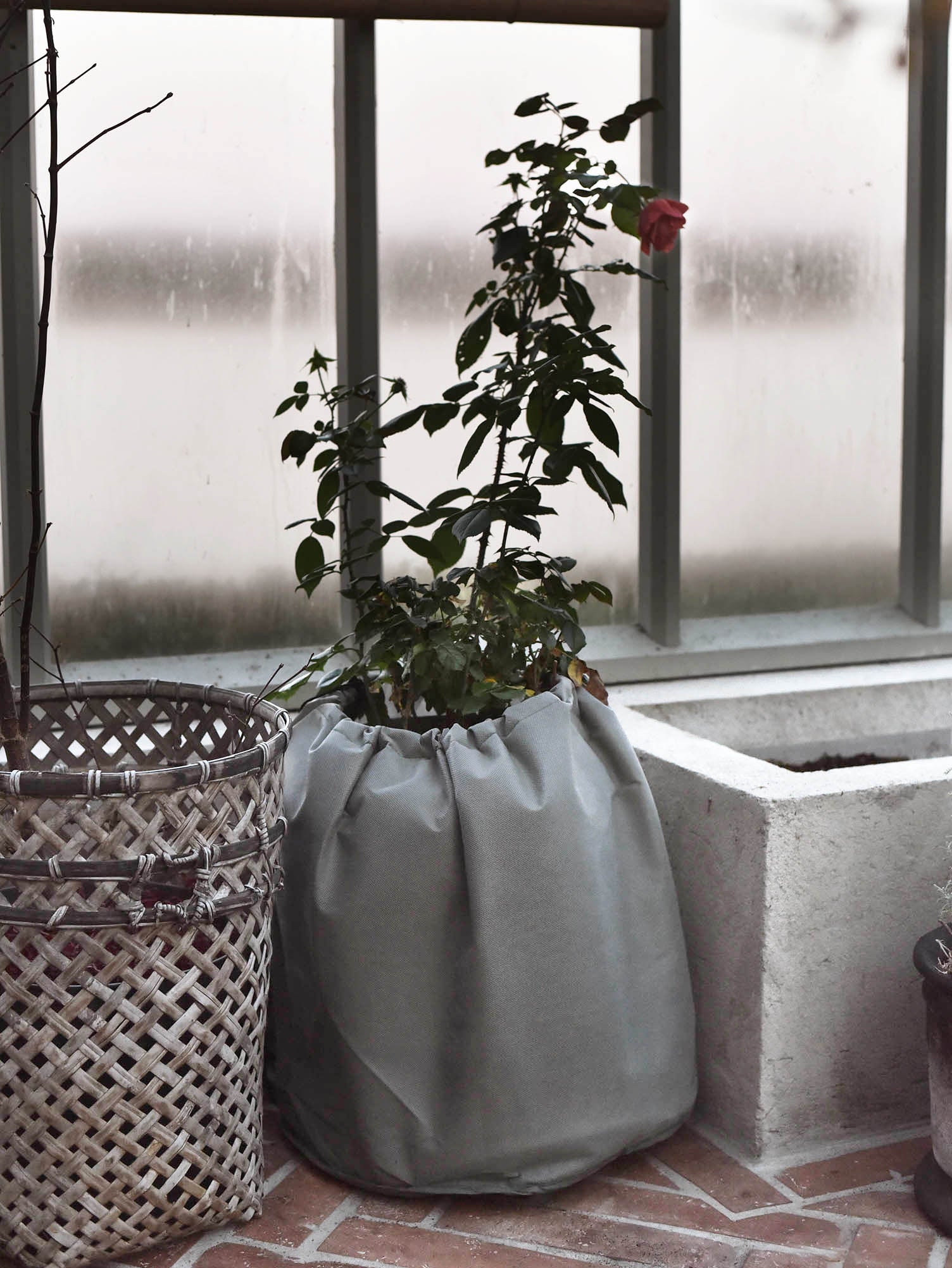 Isolerande vinterskydd för växter i kruka på t.ex. balkong. Termosäcken har både kardborrband och dragsko, vilket gör att den omsluter bra runt krukan. Växter som står i kruka utomhus behöver skyddas och det är rötterna som är de känsligaste. Därför har termosäcken en frigolitbotten som värmer underifrån. Ställ ner växten i säcken. Ta med fördel bort de sista bladen innan vinterförvaringen. Vattna inte! De mår bäst av att stå torrt under tak, intill en vägg eller oisolerat förråd.