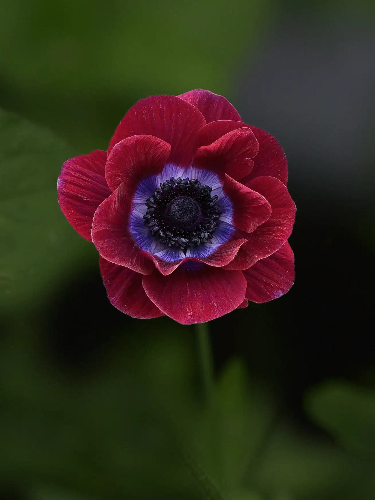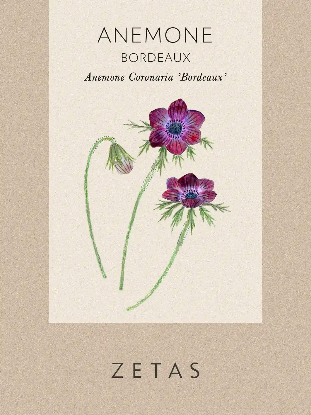 Bukettanemon 'Bordeaux'. Spektakulära stora enkla blommor, ibland med ett extra lager av kronblad. En sort som speglar den rika färgen på vinet som gav det dess namn. Ögat har är en ljus violett nyans med djärva svarta ståndare.