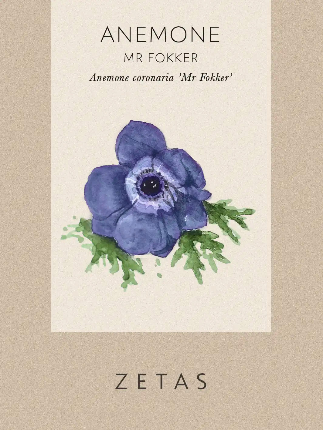Bukettanemon 'Mr Fokker'. Blommorna har en intensiv, sammetslen blå, ibland beskriven som kunglig eller elektrisk blå. Kronbladen har en silkeslen textur och en lätt kupad form, vilket ger blommorna ett delikat men ändå slående utseende.