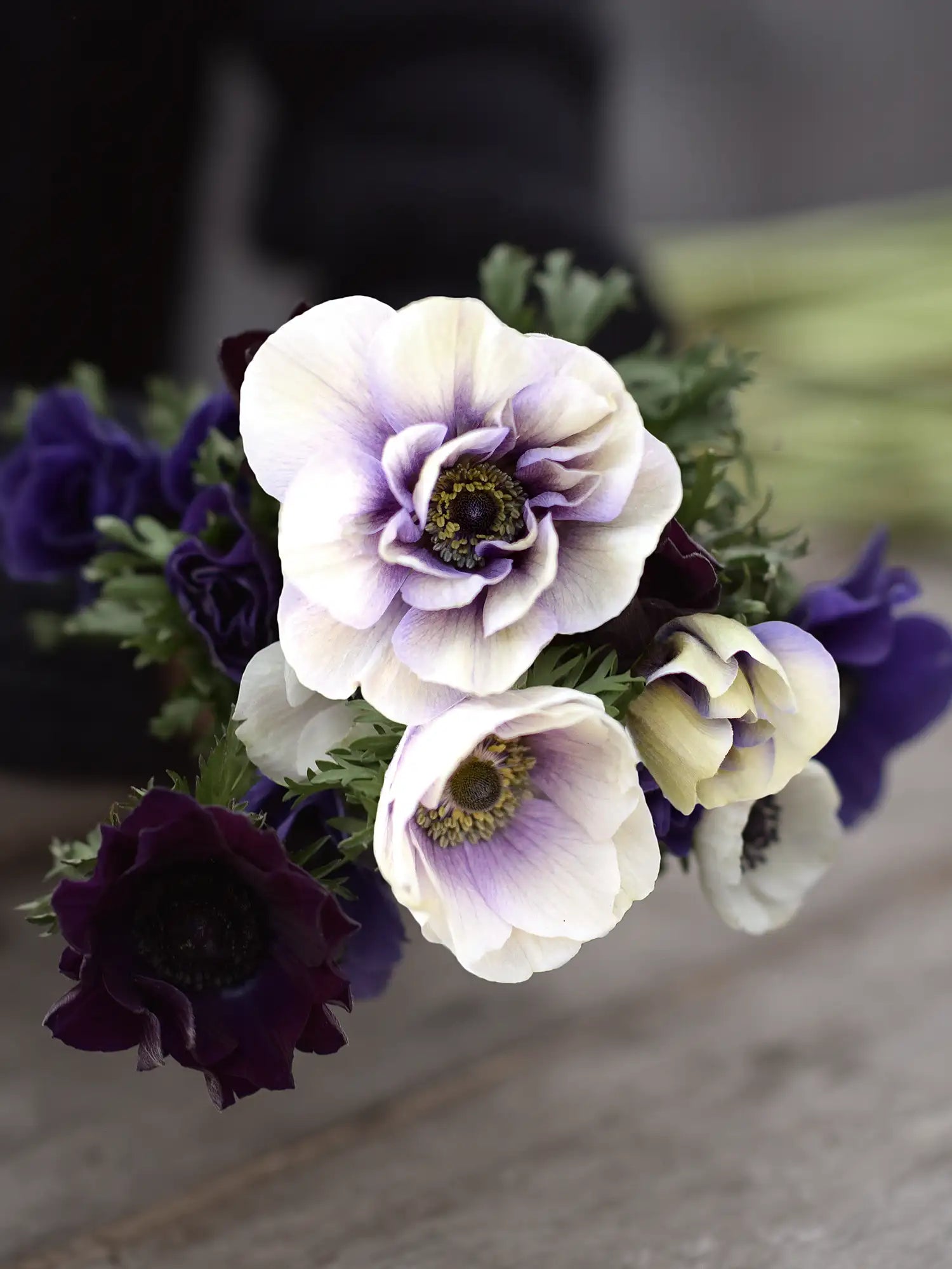 Bukettanemon 'Rainbow Blue & White'. Njut av denna vackra lyxiga flerfärgade anemon. Känd för sina stora lager på lager av kronblad och fjädergröna blad. Denna sort har vita blommor och en koboltblå nyans längst in i blomman med ett mörkt, nästan svart öga - unik och fantastiskt vacker.