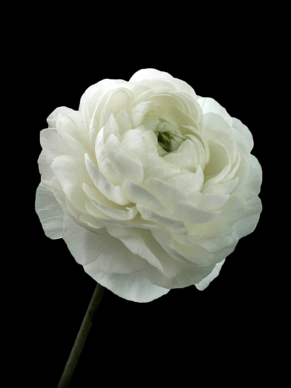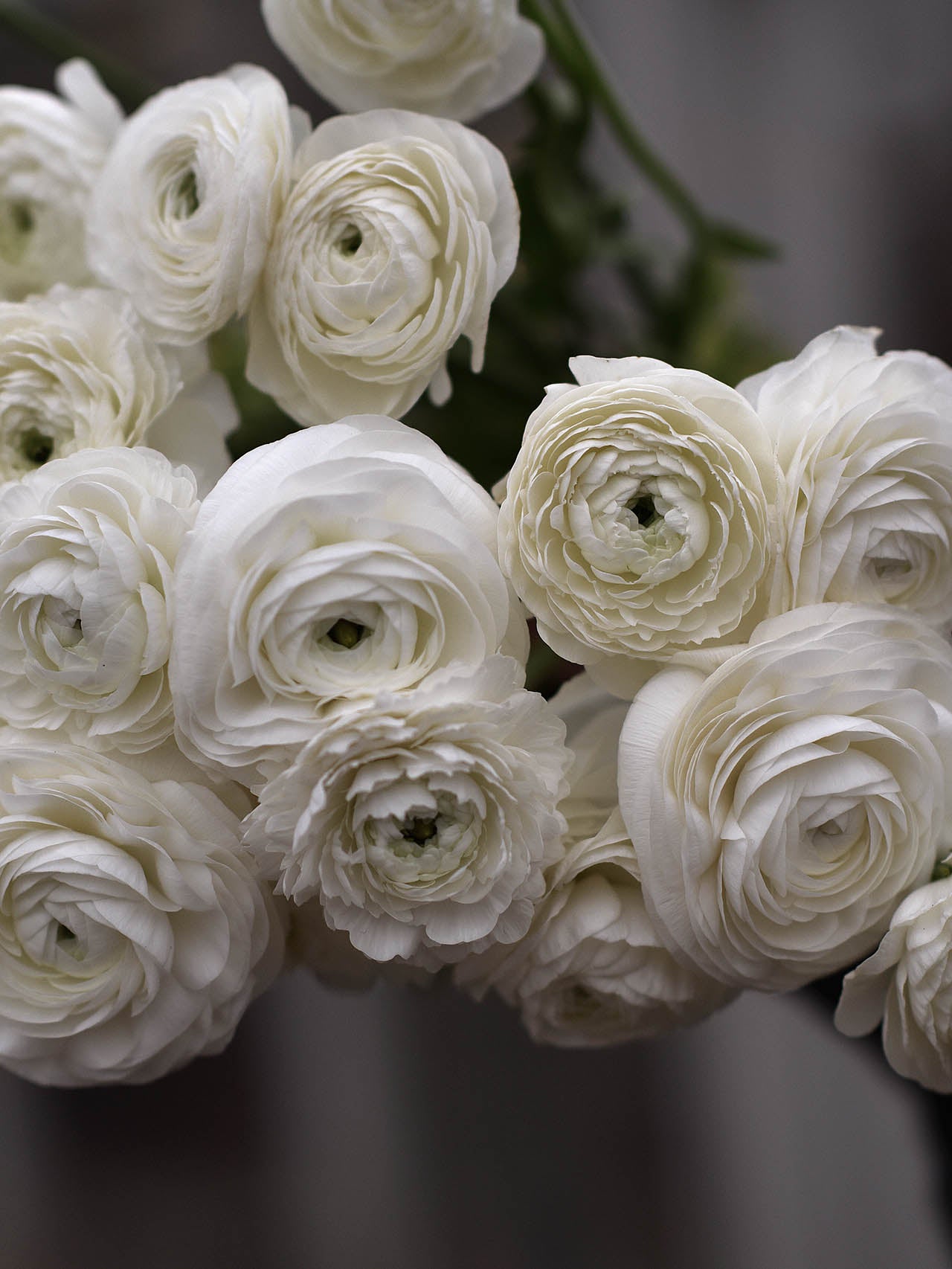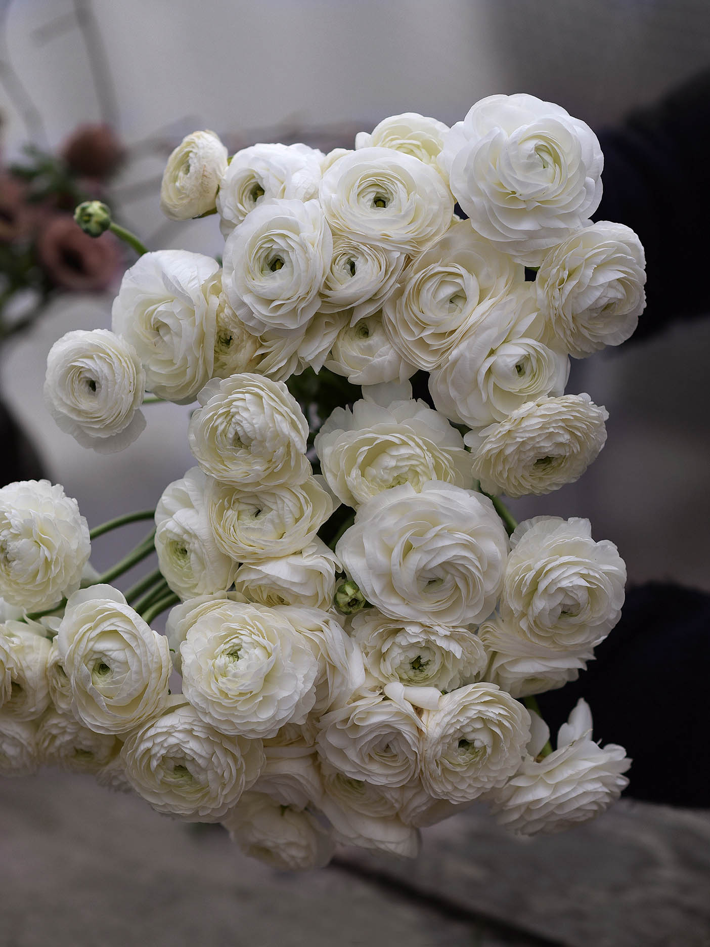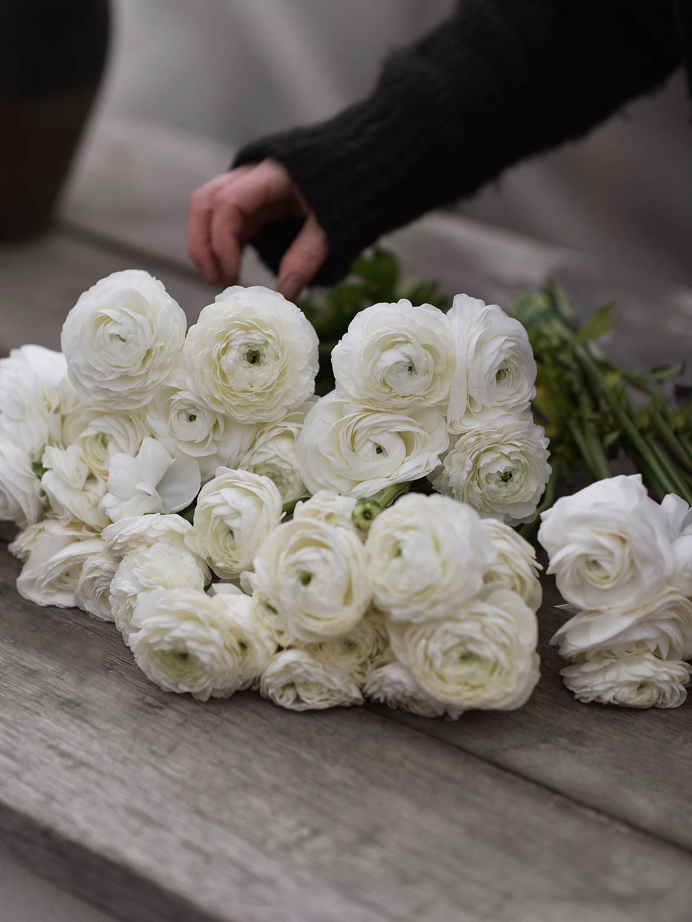 Ranunculus White. Tätt fyllda vita blommor. Blanda dem gärna i bukett med vita rosor och sommarastern ´King size apricot´.