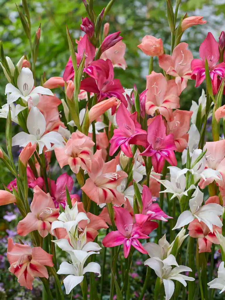 Dvärgsabellilja 'Mixed' (Gladiolus nanus 'Mixed') är en blandning av småblommiga gladioler som erbjuder en förtjusande palett av färger, från mjuka pastellrosa till ljuslila och krämiga vita nyanser. TIllsammans skapar de en lekfull känsla i trädgården och buketten. Denna mångfärgade blomma är som en vacker bukett i sig själv och en oemotståndligt vacker glädjespridare.