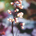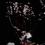Alunrot 'Black Pearl' - Heuchera blommar med vita små klocklika blommor på tunna stänglar. Den har svarta blanka blad med en rosaviolett undersida och lite vågiga kanter.