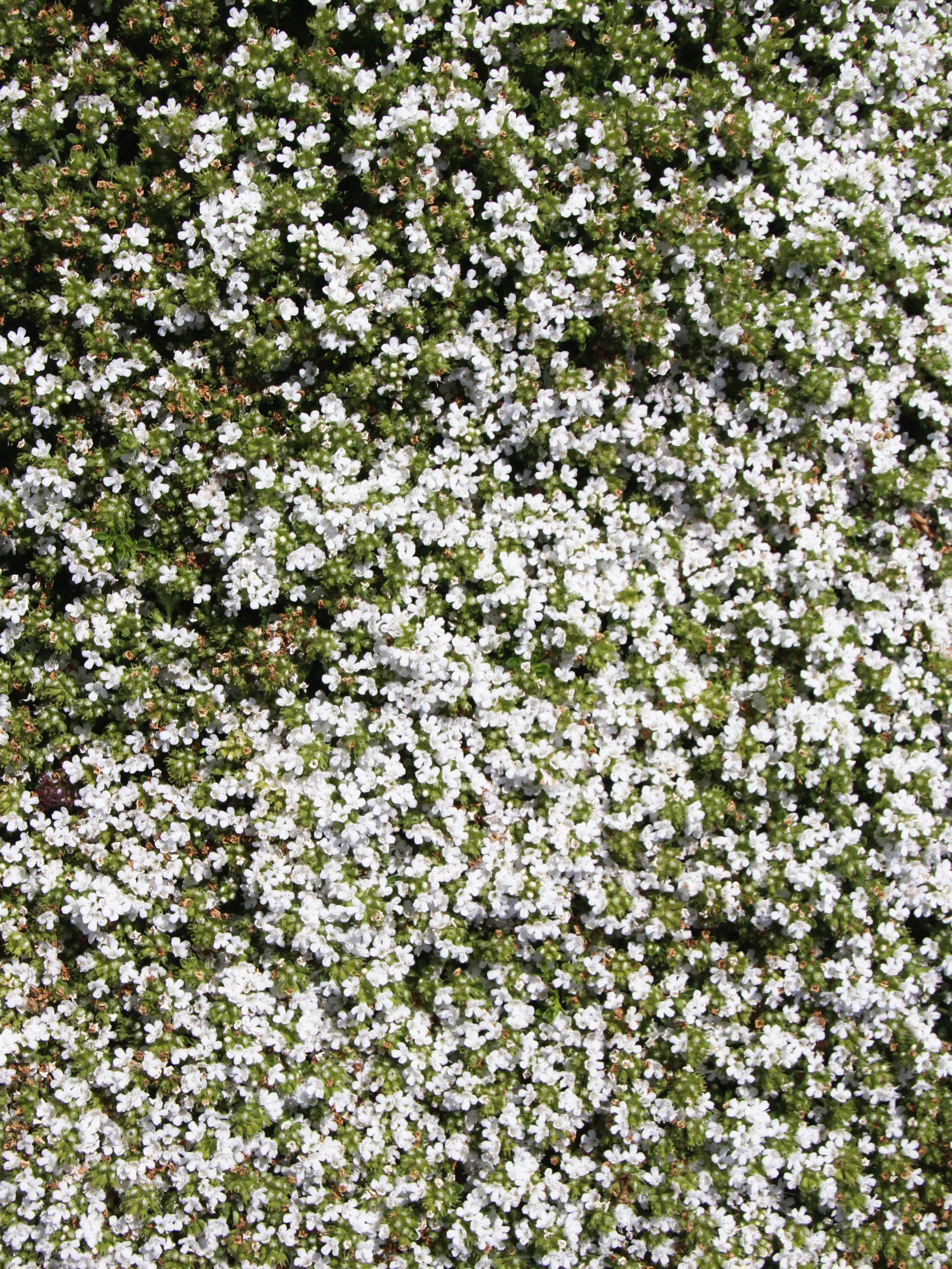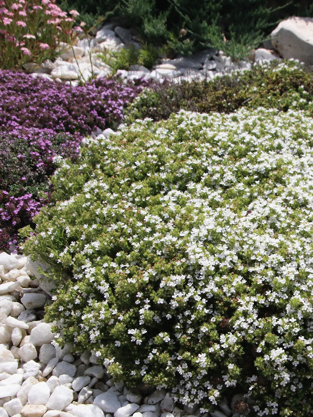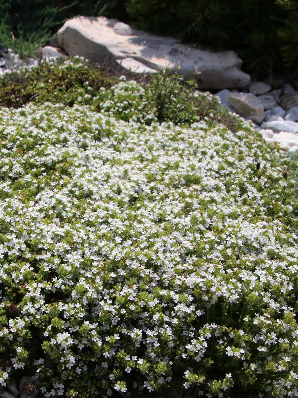 Backtimjan 'Albus', Thymus serpyllum 'Albus' är en marktäckande perenn som bildar kompakta mattor med små gröna blad och massvis av vita små blommor. Passar utmärkt i stenpartier och som kantväxt. Väl omtyckt av fjärilar, bin och andra pollinatörer.