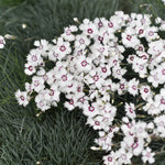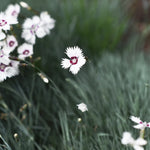 Fjädernejlika 'Marieberg', Dianthus (Plumarius-Gr.) 'Marieberg' är en lågväxande perenn med blommor i vitt och en cerise rosa mitt. Doften är kryddig. Väl omtyckt av bin, fjärilar och humlor.