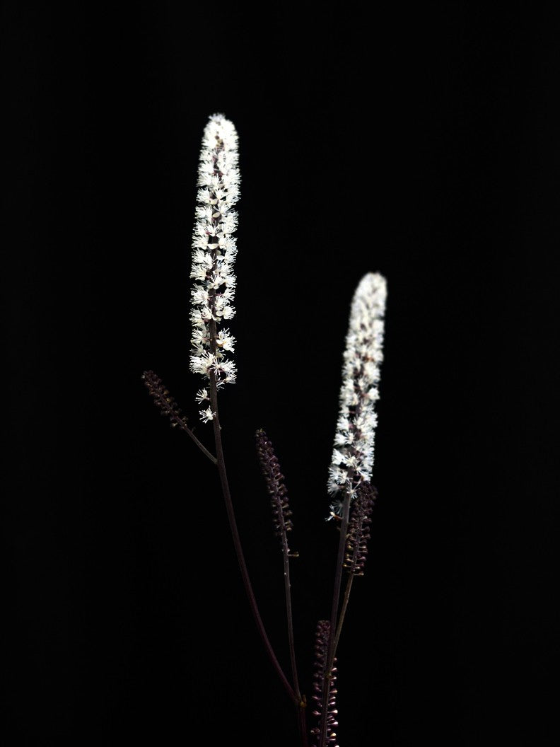 Utsökt mörkt purpurbrunt bladverk som bildar en stor rugge. Täta mörkt rosa blomax som slår ut i gräddvita blommande ax. Den blir ca 150-170 cm hög.