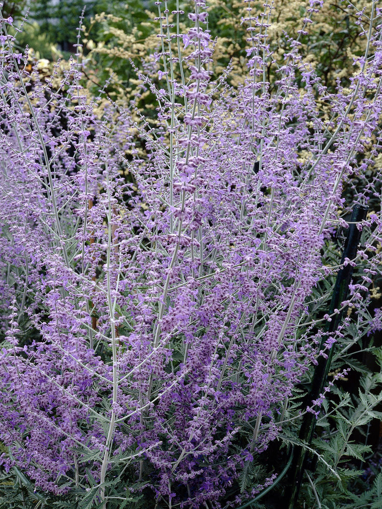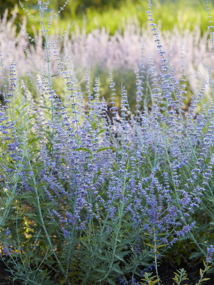 Perovskia fryser ofta ner under vintern men kommer igen med nya skott som blommat samma år. Samplantera med t.ex. röd rudbeckia, röllika, vitmalört, bolltistel, vit purpurklätt. Planteringsavstånd 50cm.