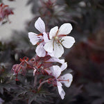 Praktnäva 'Midnight Ghost', Geranium pratense 'Midnight Ghost' är en dramatisk näva med mörkväxande bladverk och vita blommor med rosa ådringar längs kronbladen.