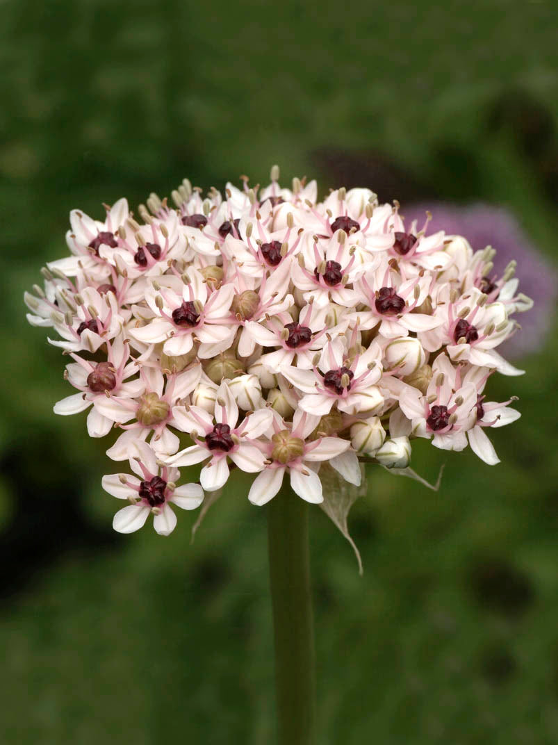 Allium ’Silver Spring’ är mycket vacker i flera stadier. Blomman är halvklotformad, färgen är vit med rosa botten och svart öga. Den torkade blomställningen är också dekorativ. Planteras 15 cm djupt i normal trädgårdsjord.