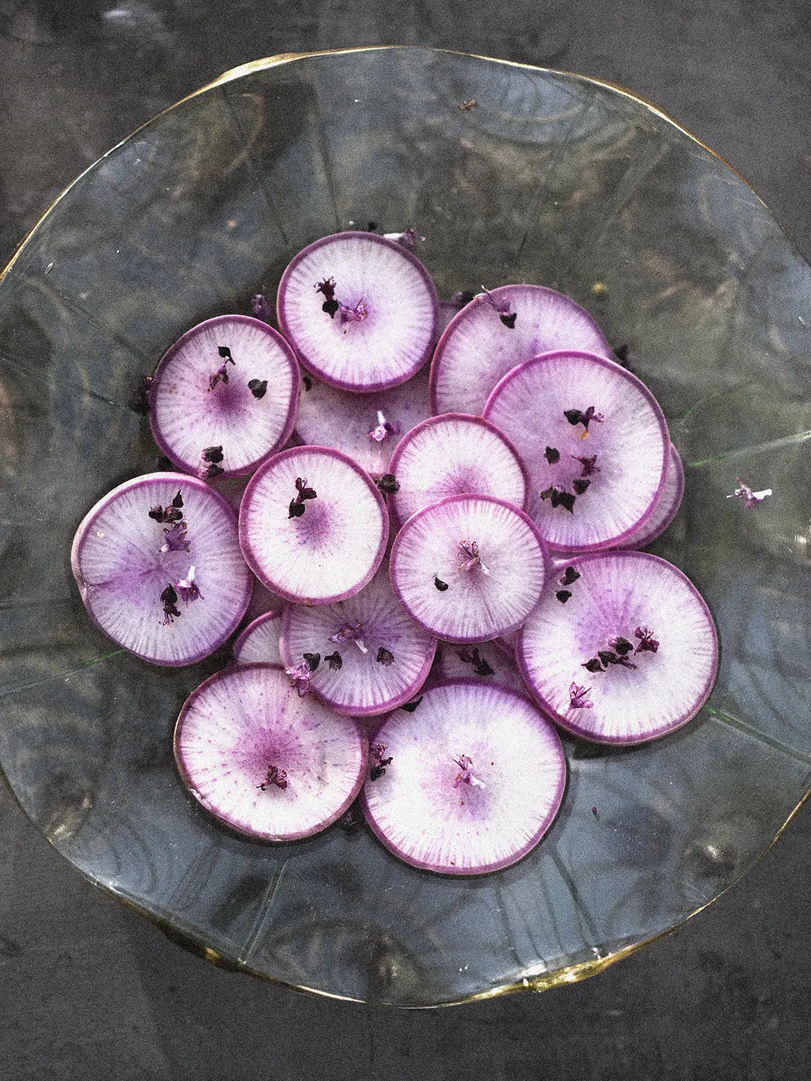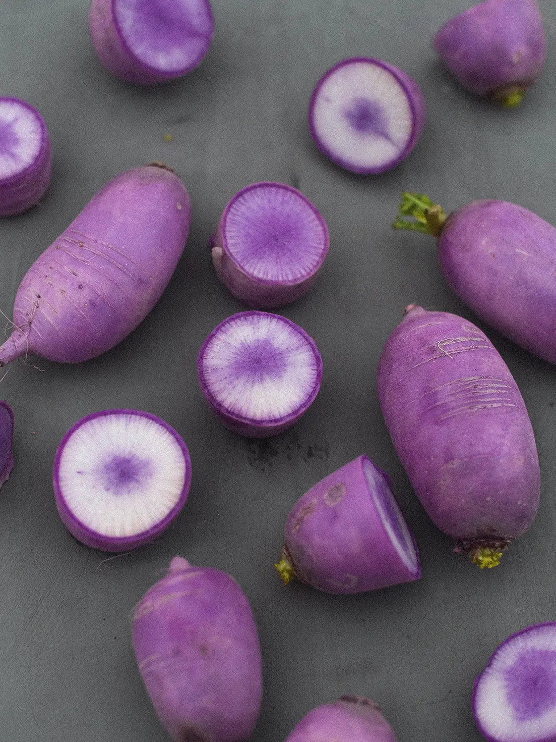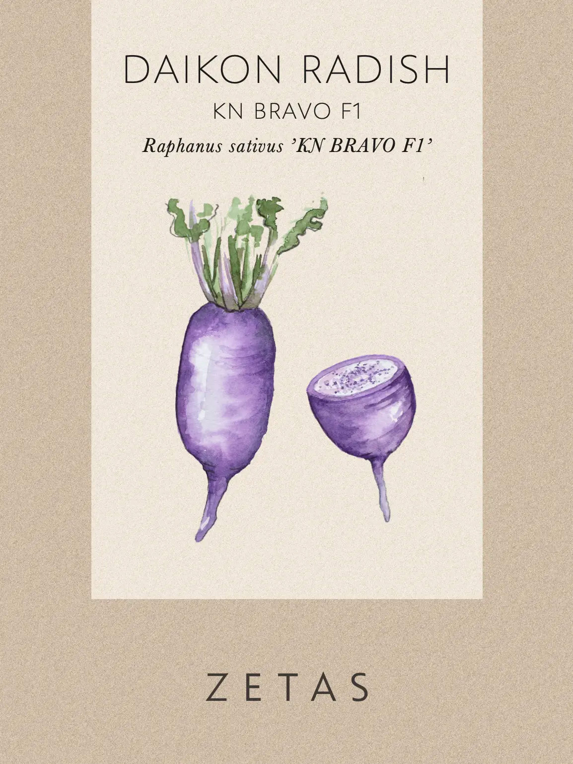 Rädisa/Daikon 'KN BRAVO F1' har länge odlats i Asien. Denna sort har goda söta rötter som ger vacker färg till fräscha sallader och kimchi. Färgen varierar från ljuslila till vit med lila ränder. 5–10 procent kommer att ha vita rötter.
