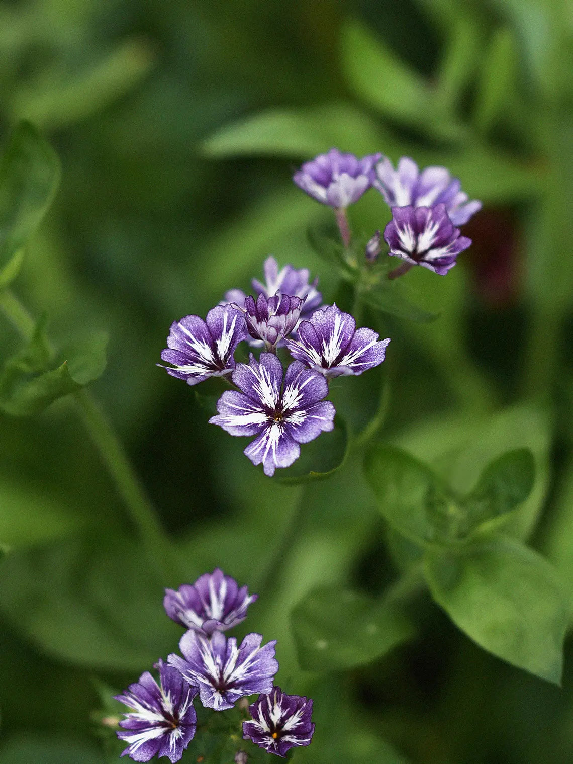 blå och lila med en vit, stjärnformad mitt. Vackert i både rabatter och krukor. Utmärkt