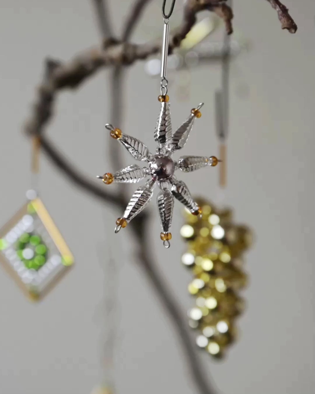 Varje prydnad är handgjord i Poniklá, Tjeckien, med en unik metod där små glaspärlor blåses, försilvras, färgas och skärs innan de träs samman för hand. Resultatet är en skimrande dekoration av sällsynt hantverksskicklighet, en tradition som idag är erkänd av UNESCO som ett kulturarv.