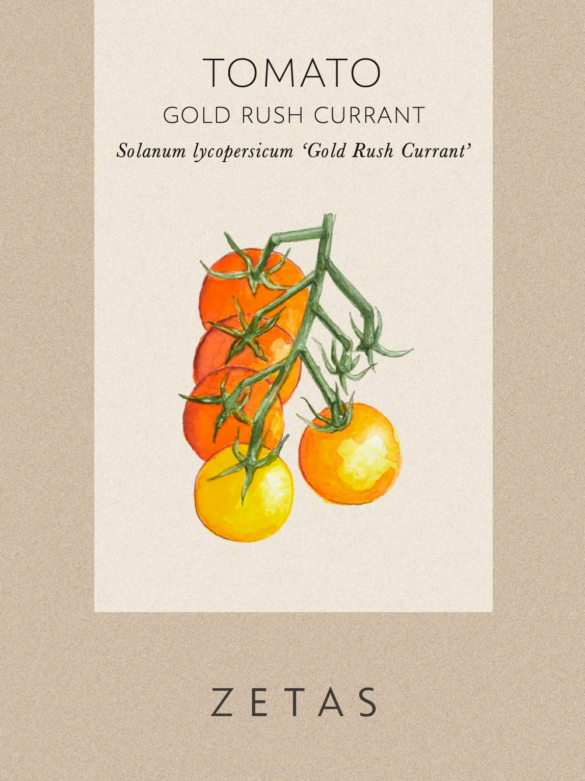 Tomat 'Gold Rush Currant' är en mycket högavkastande sort som ger ljust gyllene orange, sött smaksatta små frukter. En perfekt tomat till mellanmål och sallader. Vikten är cirka 10 gram. Ekologiska frön.