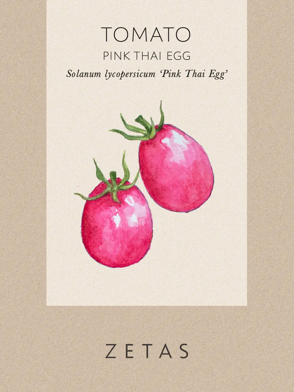 Tomat 'Pink Thai Egg' är en vacker, äggformad tomat med glänsande, rosa skal. Sorten kommer från Thailand och har en fräsch och söt smak som passar perfekt i sallader. Växten är produktiv och frukterna är resistenta mot sprickbildning. Vikt: 15-30 gram. Ekologiska frön.