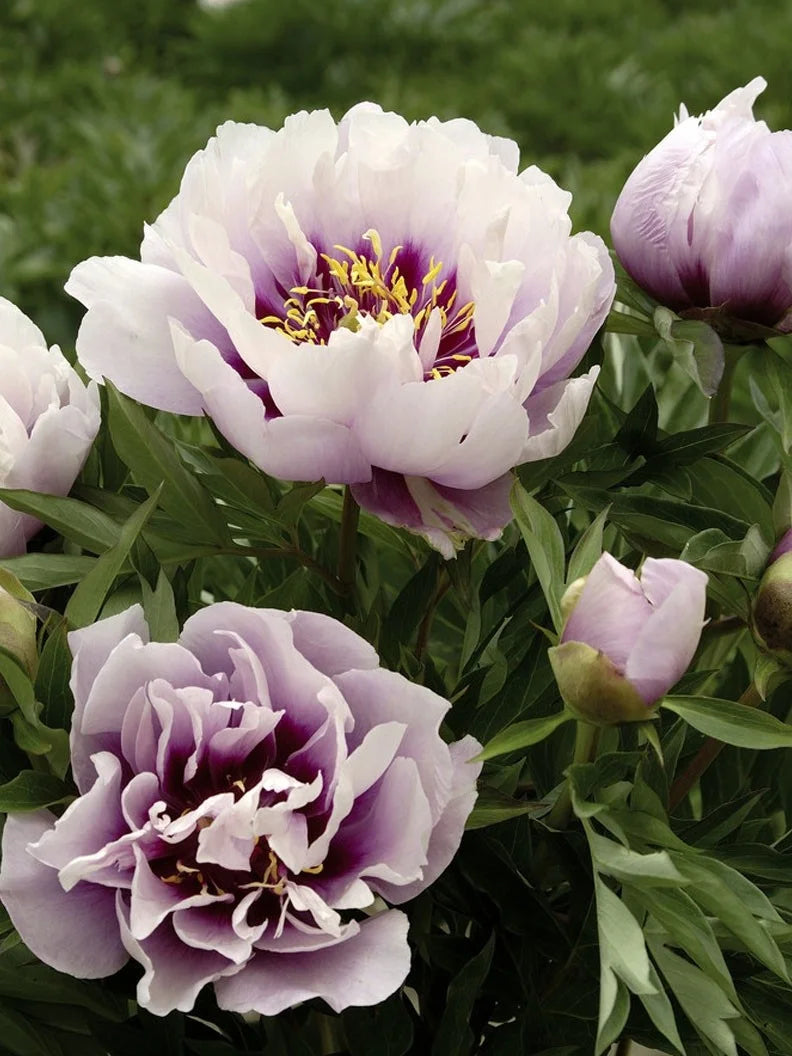 Paeonia Itoh hybrid ’Cora Louise’ är en liten raritet. Den är en korsning mellan vanlig örtartad pion som vissnar ner på vintern och vedartad pion, en buske som övervintrar med grenar ovan marken. ’Cora Louise’ är mycket stora, halvfyllda buskpionblommor som öppnar sig helt och visar upp ett inre fyllt med rikligt av guldgula ståndare och en svag, fin doft.