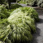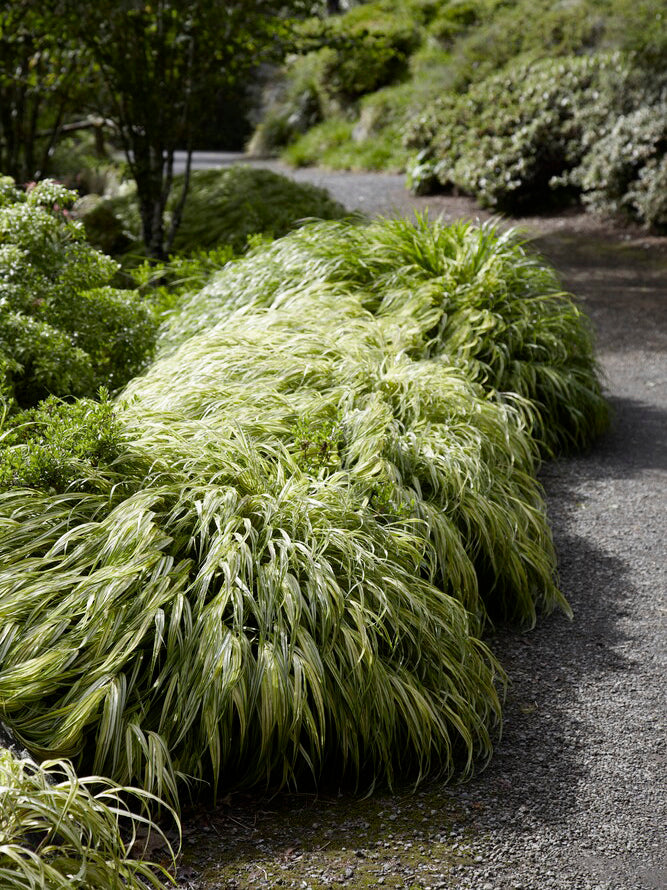 Ett mycket vackert gräs som växer i stora böljande tuvor. Grästuvan liknar en stor peruk med bambulika blad som rör sig i minsta vindpust. Ett tåligt gräs som ofta används i offentlig miljö. Hakonegräs växer i täta tuvor som kan bli stora, sprider sig med utlöpare och vill gärna ta över i en samplantering.