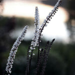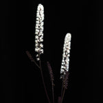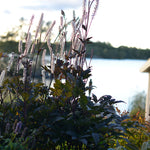 Utsökt mörkt purpurbrunt bladverk som bildar en stor rugge. Täta mörkt rosa blomax som slår ut i gräddvita blommande ax. Den blir ca 150-170 cm hög.