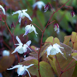 Japansk sockblomma, Epimedium grandiflorum, får spindellika vita blommor med sporrar, som sitter i glesa blomställningar i maj-juni. Det är den mest storblommiga arten. Bladen är som spetsiga hjärtan, fint tandade och ofta rödkantade. Det bronsfärgade bladutspringet är mycket dekorativt.