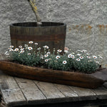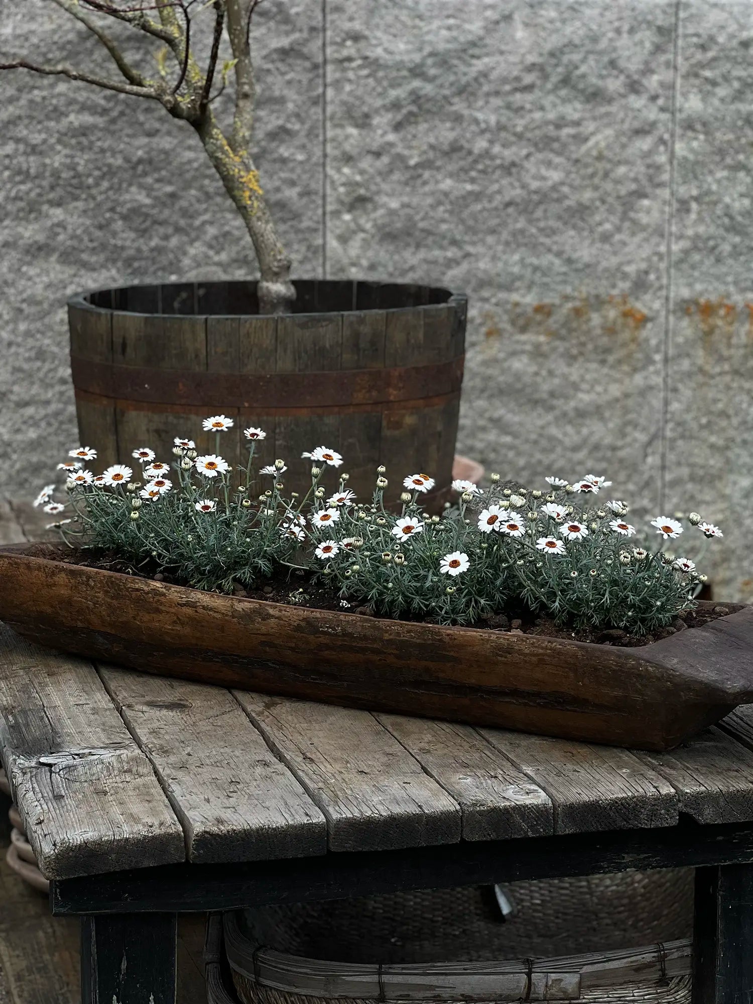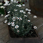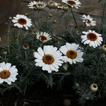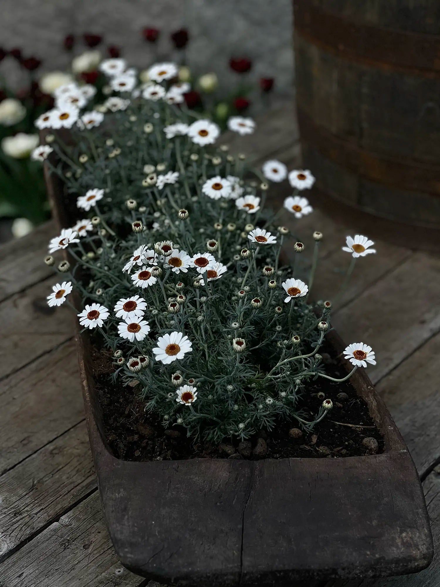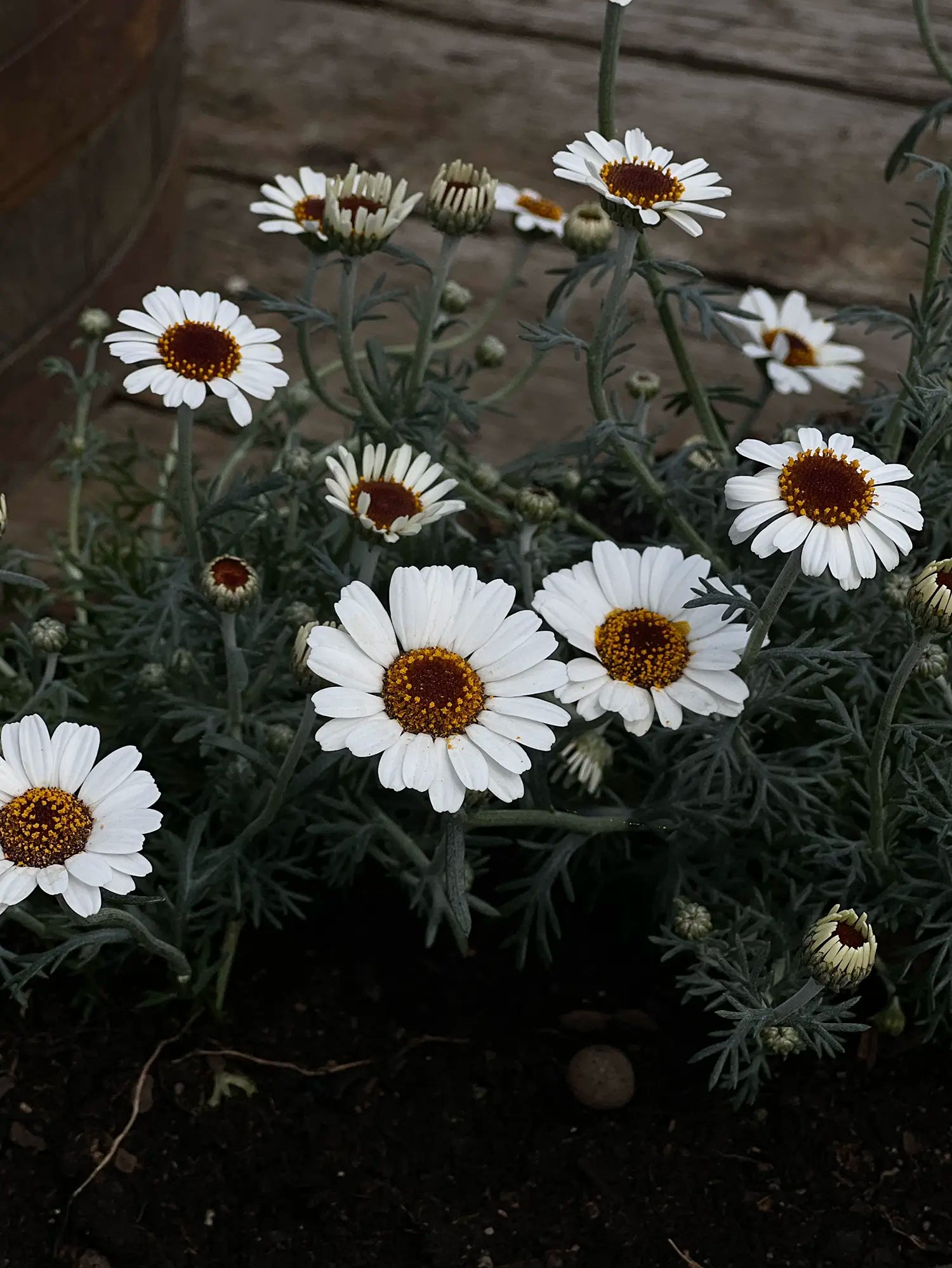 Marockansk margerit, Argyranthemum frutescens får vita krispiga kronblad med en mörkorange mitt. Silvrigt bladverk. Denna sort trivs bra i soligt läge. Den är även tålig att planteras ut tidigt på våren. Lång blomning! Ta bort utblommade blommor för att hjälpa bildandet av nya. Kan övervintras med täckning. Trivs i mager och torr jord.