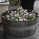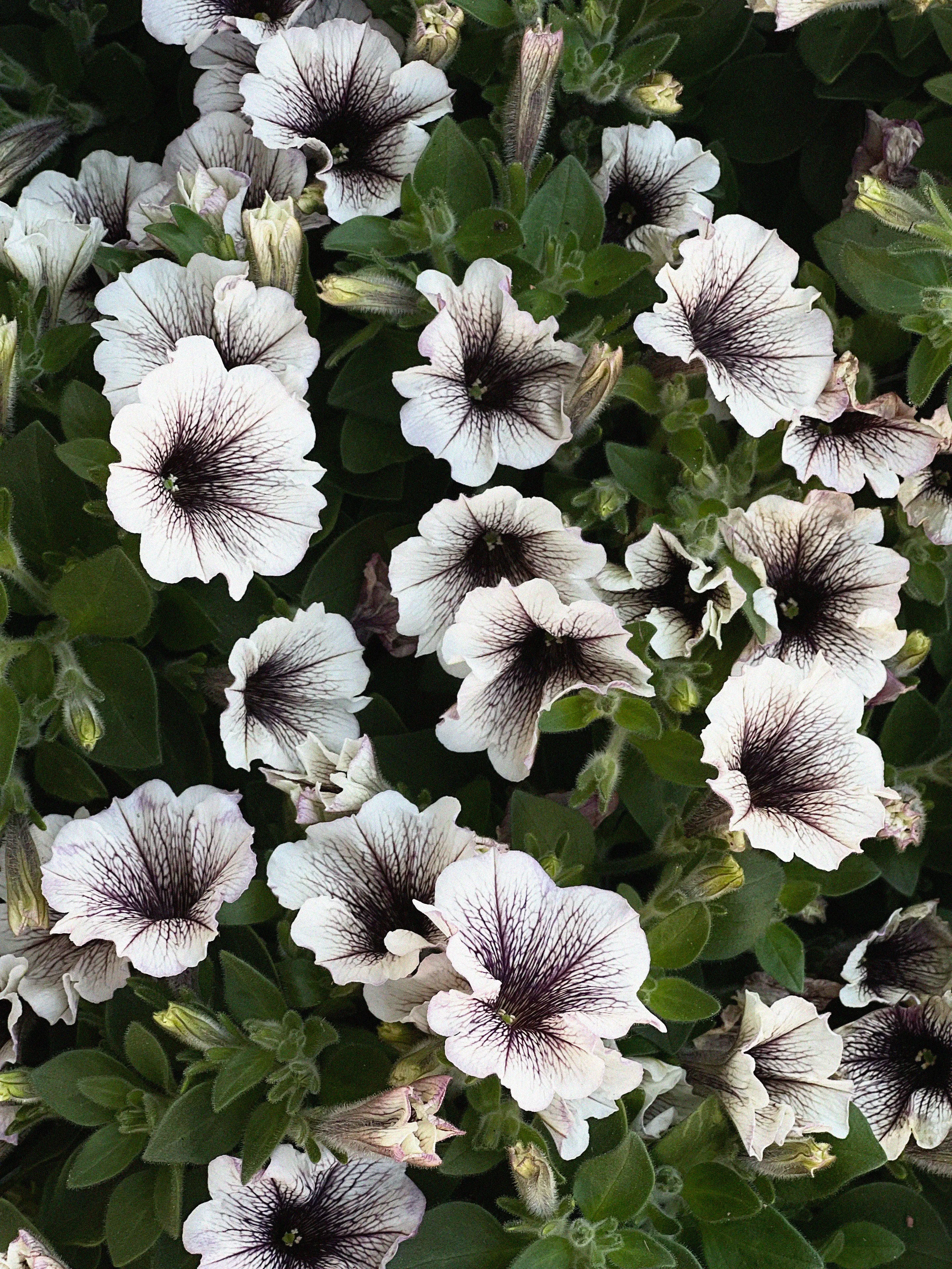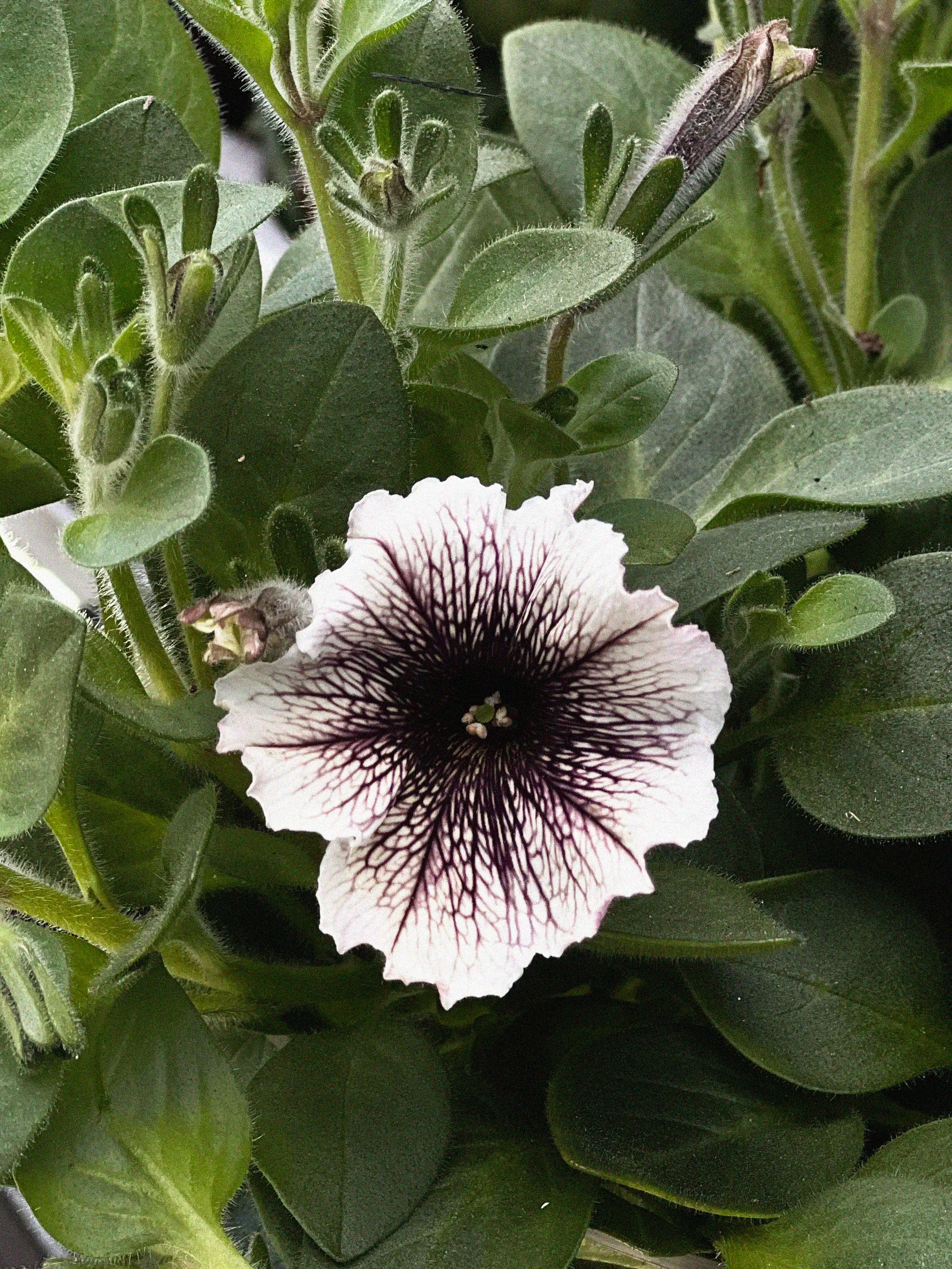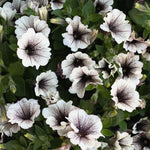 Petunia (Surfiniaserien) 'Tiramisu', Petunia x hybrida Tiramisu' är en enkelblommig petunia. Blommorna får en ovanlig färgsättning med chokladbrun/lila mitt som sedan tunnas ut i en krispig vit färg. Kompakt växtsätt. Plocka gärna vissna blommor löpande för längre och bättre blomning. En mycket lättskött och enkel växt.