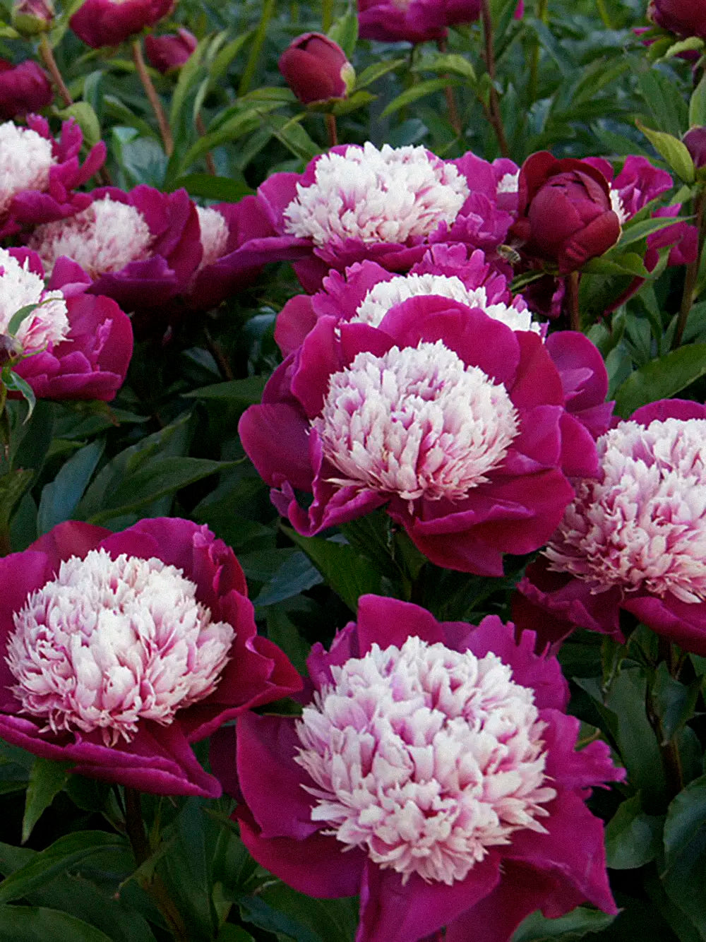 Paeonia 'White Cap'. Den här pionen ligger på vår topplista som en av de vackraste, och med den allra ljuvligaste doft ni kan tänka er. Den har vackert vinröda kronblad som omfamnar en gräddig botten. Blommar länge då den bildar många sidoknoppar. Växer stadigt och behöver som regel inget stöd. Samplantera med rosa fingerborgsblommor och vit myskmalva.
