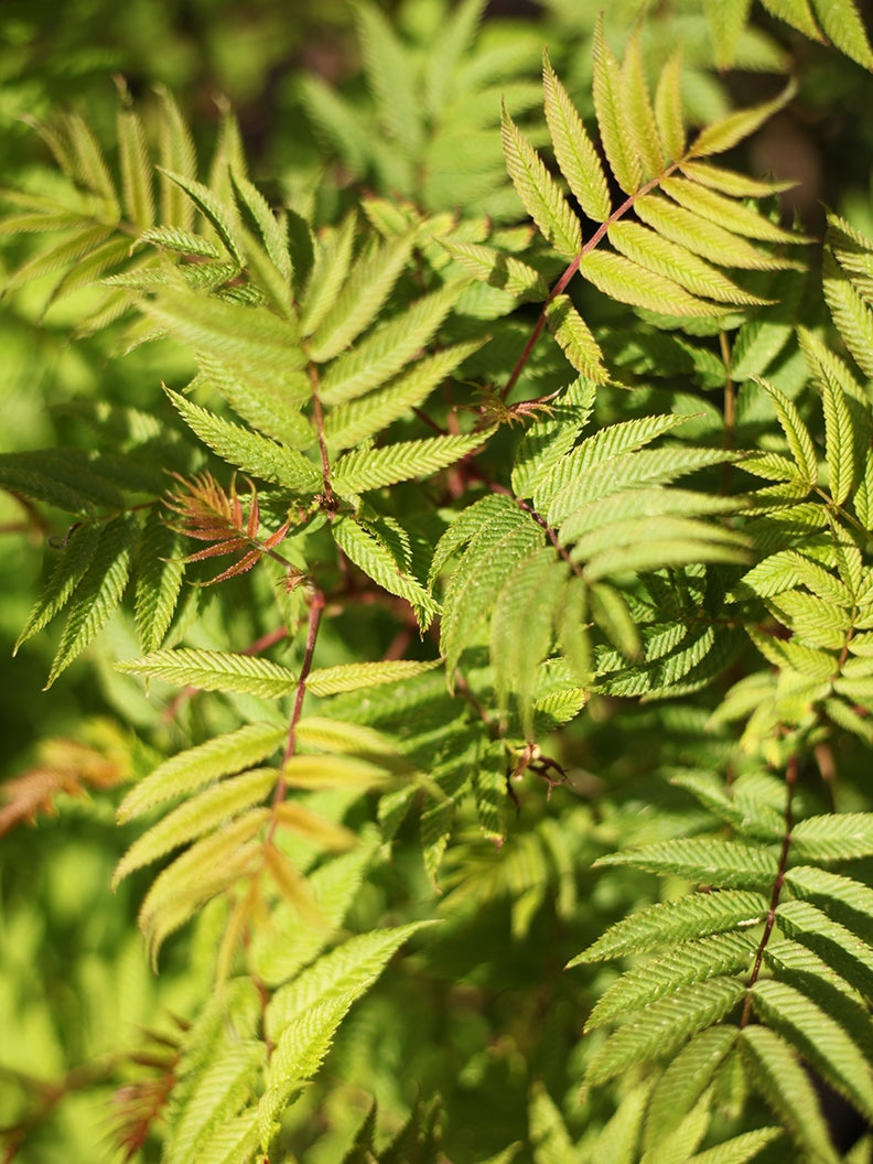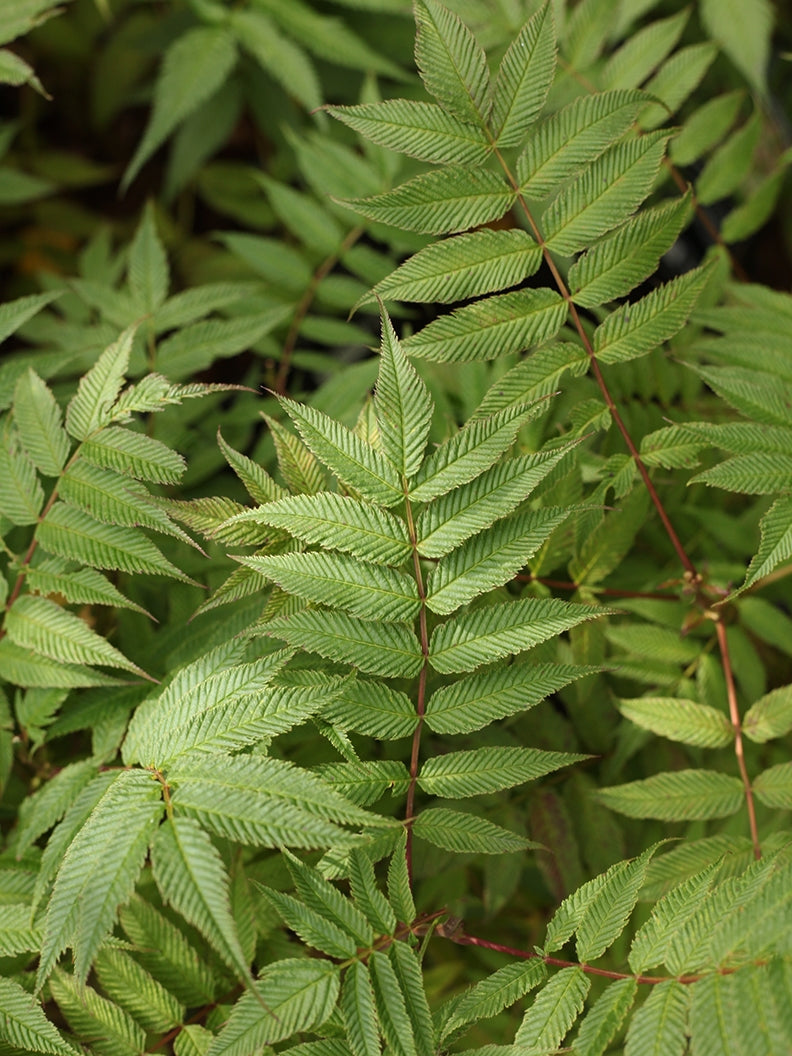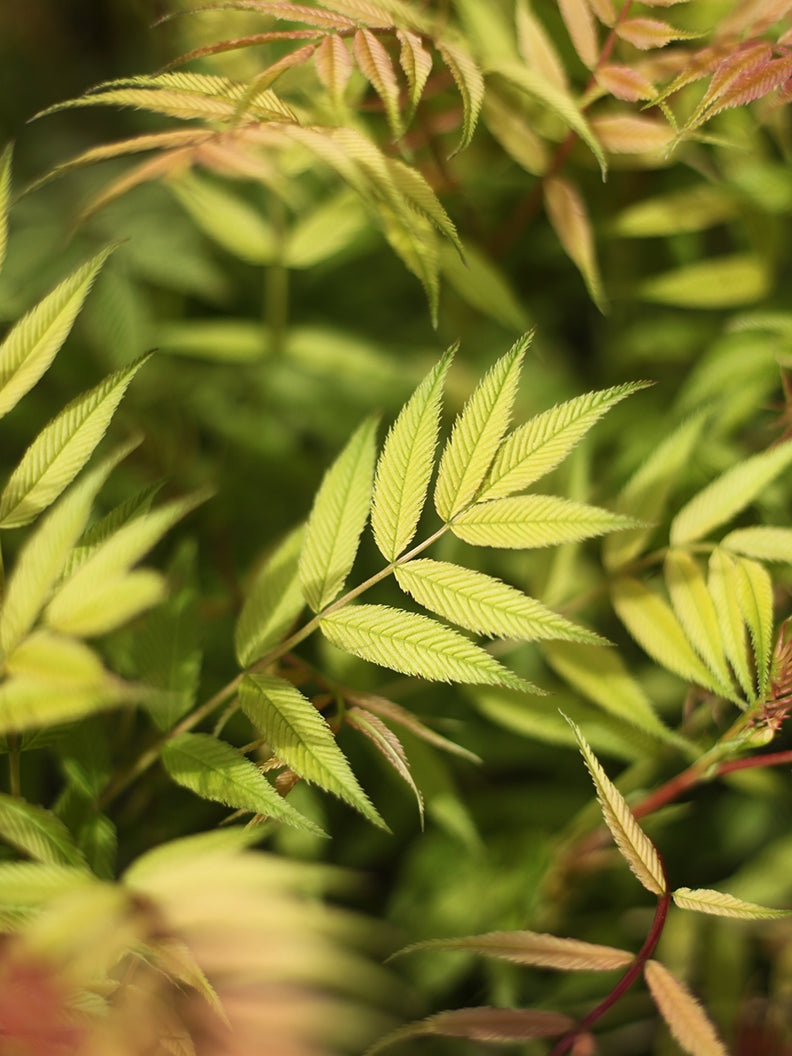 Rönnspirea, blir en 1–1,5 meter hög buske. Bladutspringet är vackert rosa som övergår i limegult och senare grönt på sommaren. Graciöst rönnliknandes bladverk som ger mycket grönska med sina många flikiga blad. Den bryter tidigt på våren utan att skadas av vårfrost. Får vacker höstfärg. Blommar med rent vita blommor i blomklasar från mitten av juli och lång in på hösten. Även i knoppstadiet är blommorna vackra, då ser de ut som små vita pärlor.