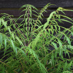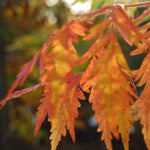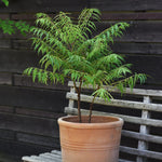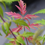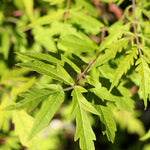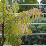 Bladverk: Vacker finflikig rönnsumak där nytillväxten är grön, men övergår snabbt till guldgult vilket gör sig fint till de purpurrosa bladstjälkarna.