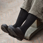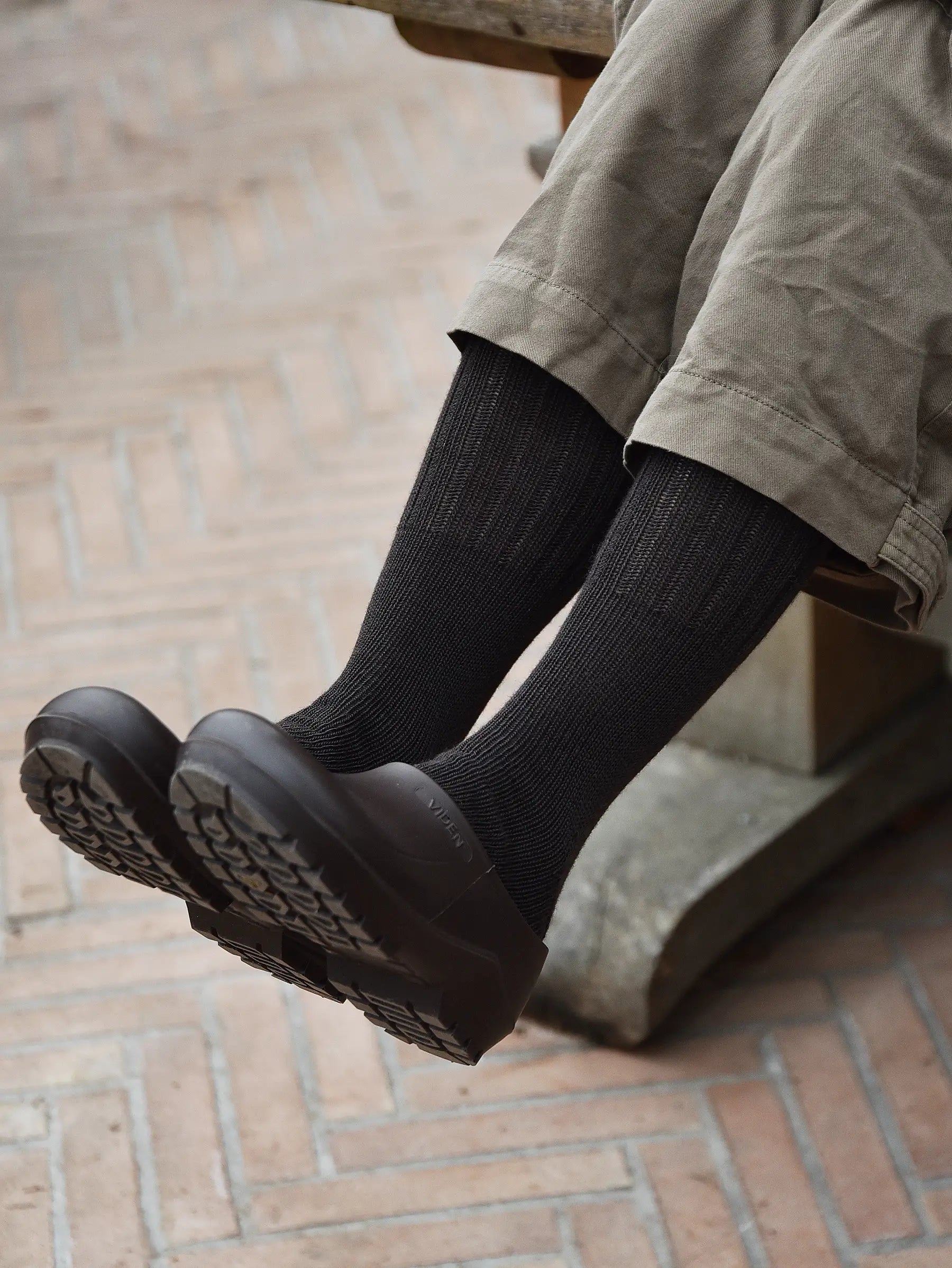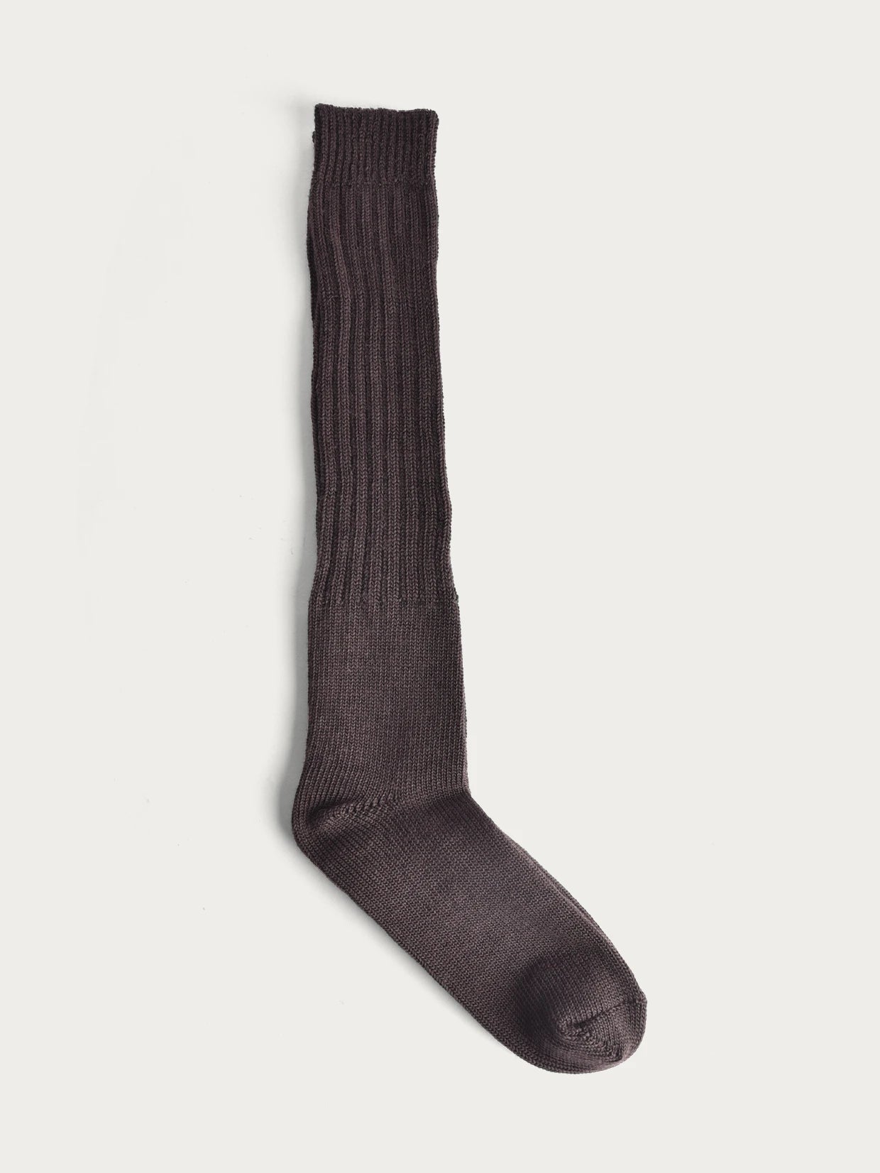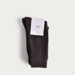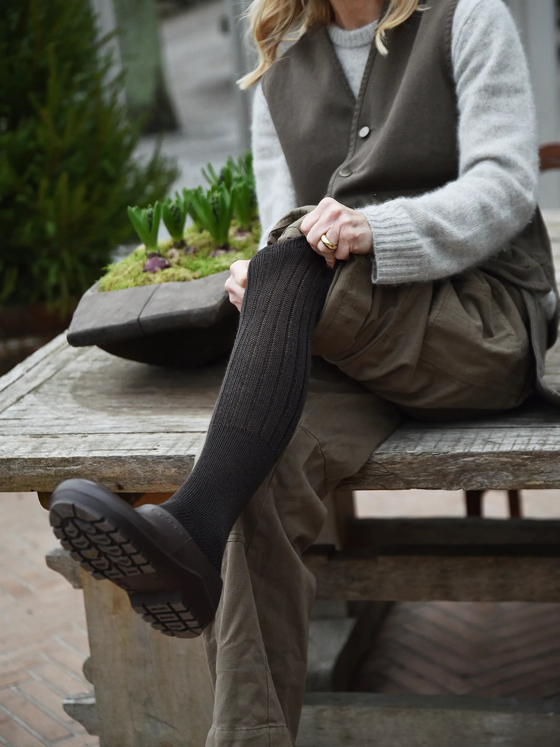Knästrumpor i ull 'Ribbed' dark brown är mjuka och slitstarka trädgårdsstrumpor, skapade för årets alla säsonger. Vävd i en vacker mörkbrun nyans som smälter in naturligt bland rabatter och gångar.
