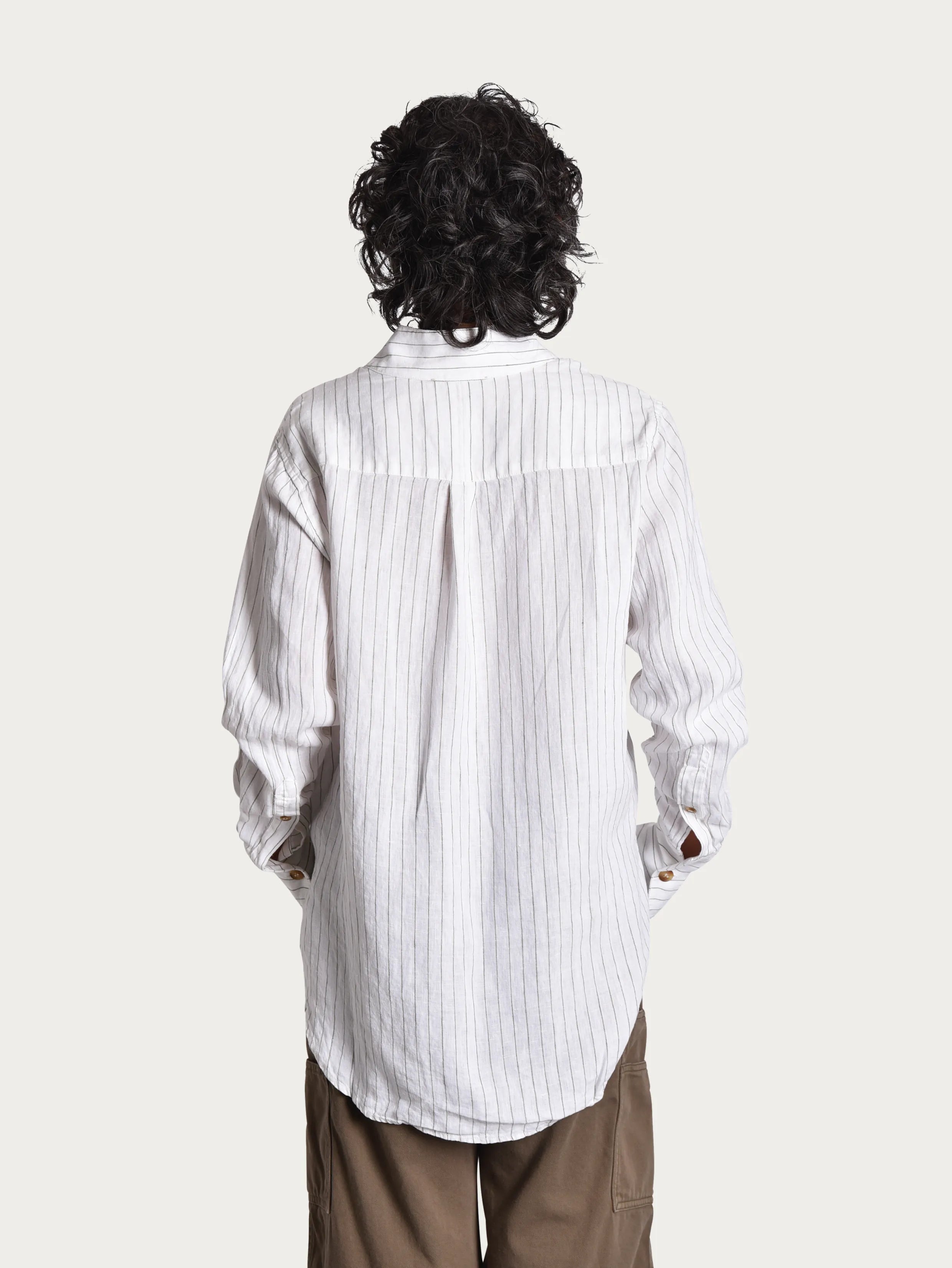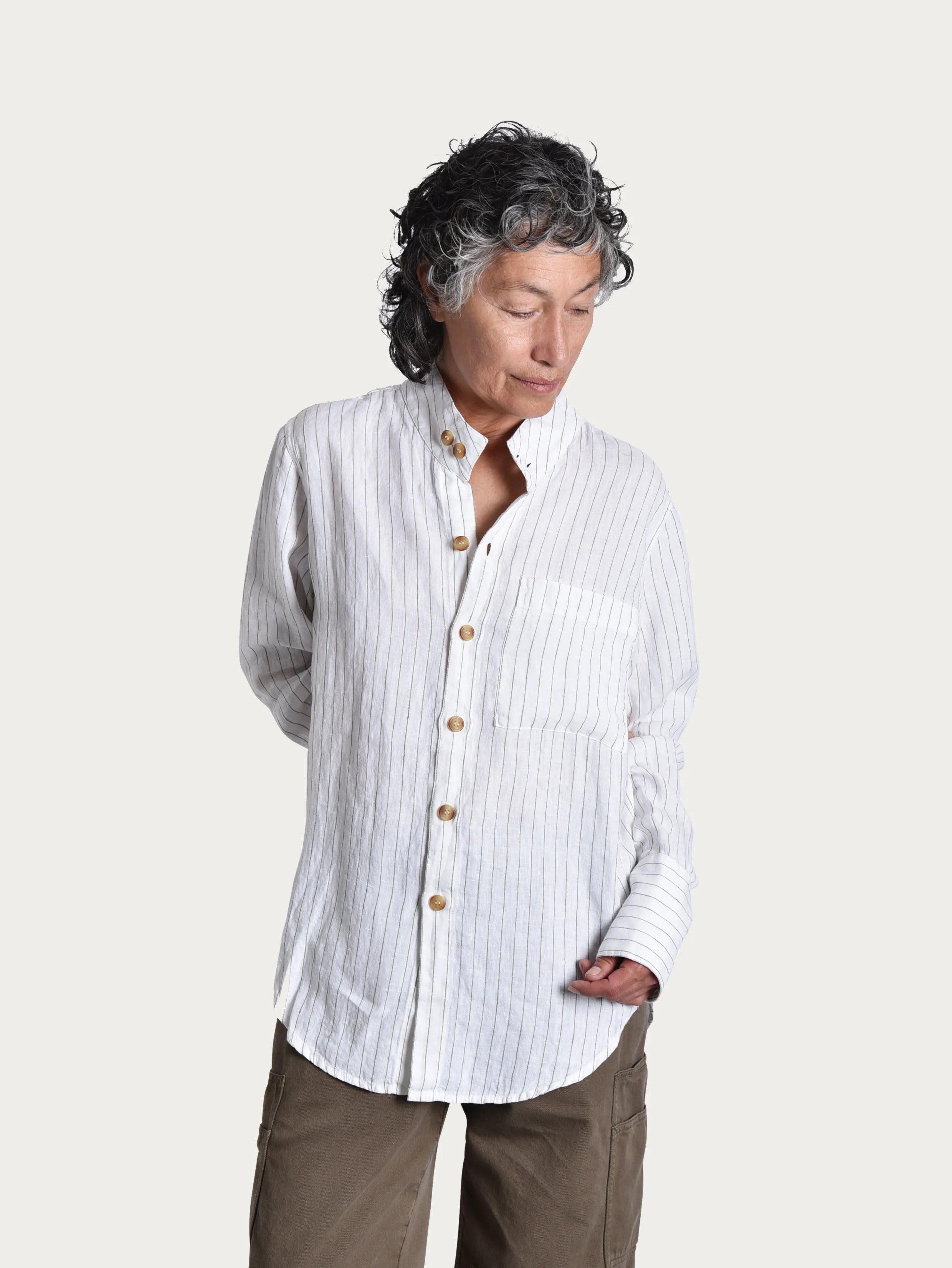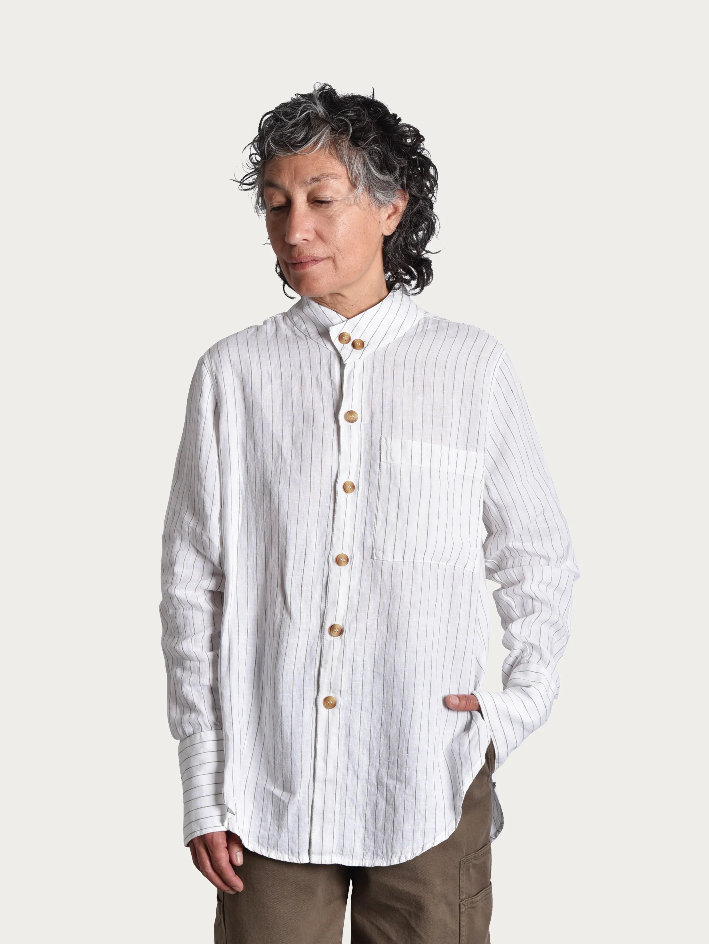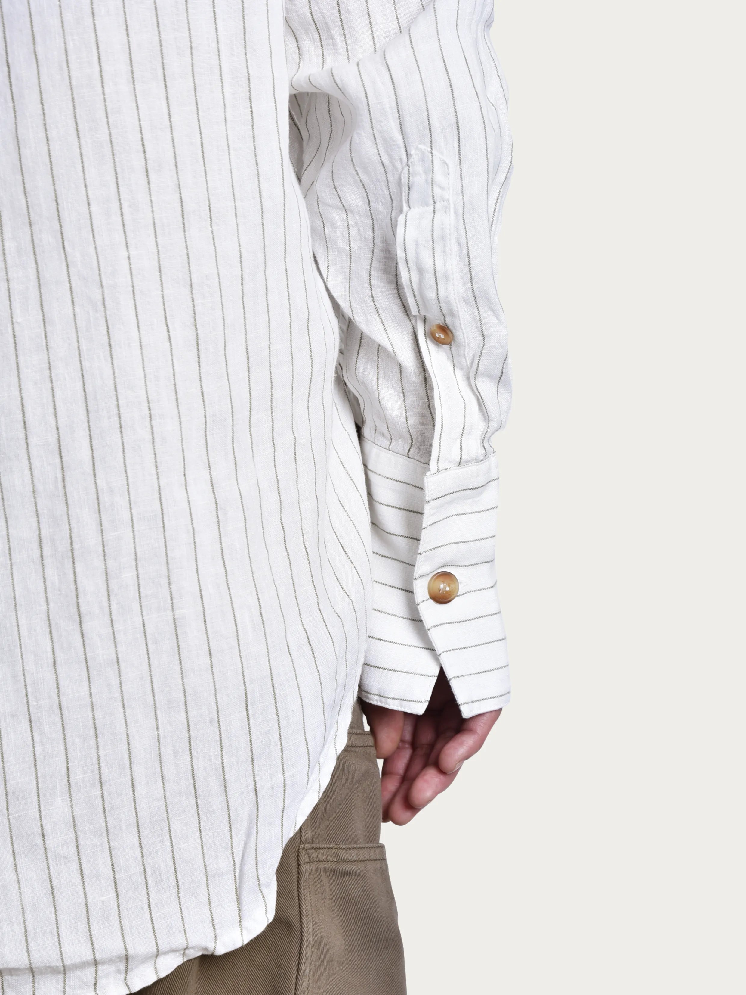 Trädgårdsskjortan Lark stripe white/green är en lätt och luftig arbetsskjorta i vitt med mörkgröna smala ränder. Kragen har en avskalad design med två knappar, enkel att öppna när du behöver röra dig fritt – perfekt för långa dagar i trädgården. Skjortan är också utrustad med en generös bröstficka för små nödvändigheter.