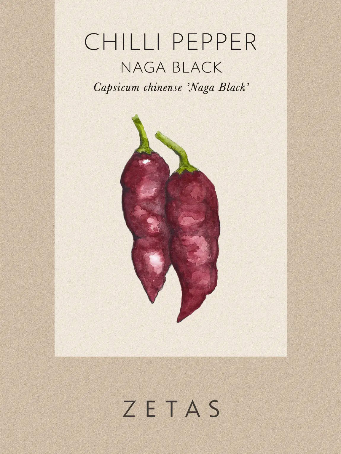 Chilipeppar 'Naga Black' är en mycket het och smakrik Habanero-typ som ger rikligt med vackra, brunsvarta frukter. Hantera med försiktighet på grund av den höga nivån av capsaicin som gör ont i ögonen. Frukterna är 8-10 cm. Kryddighet: 800 000 Scoville.