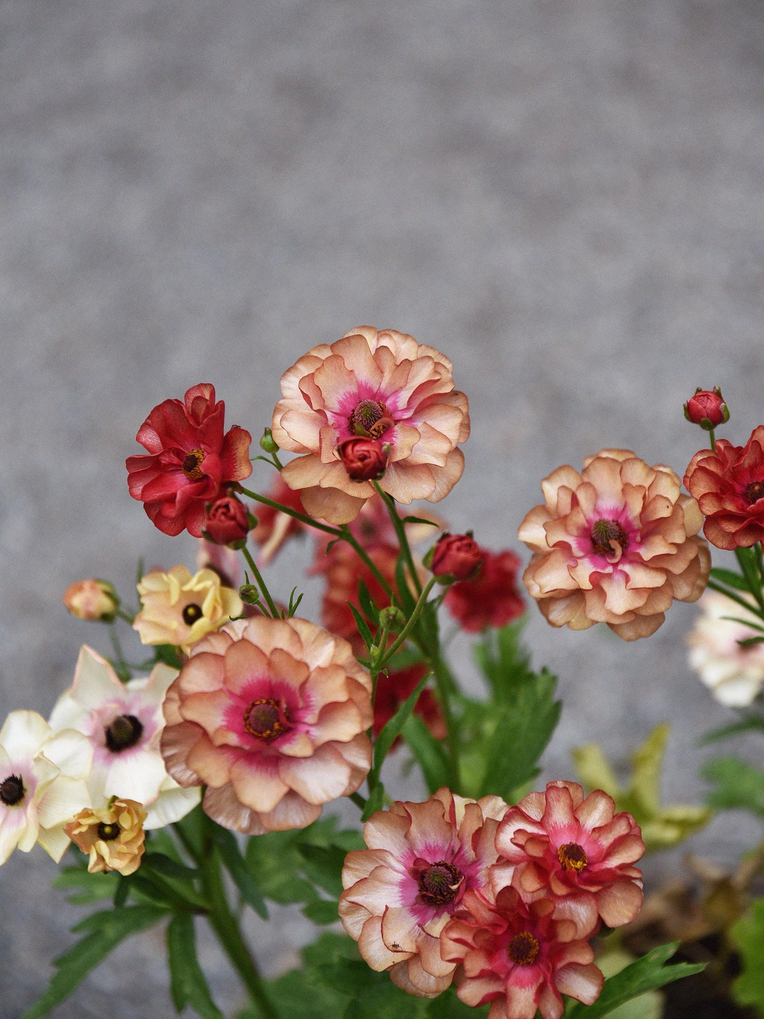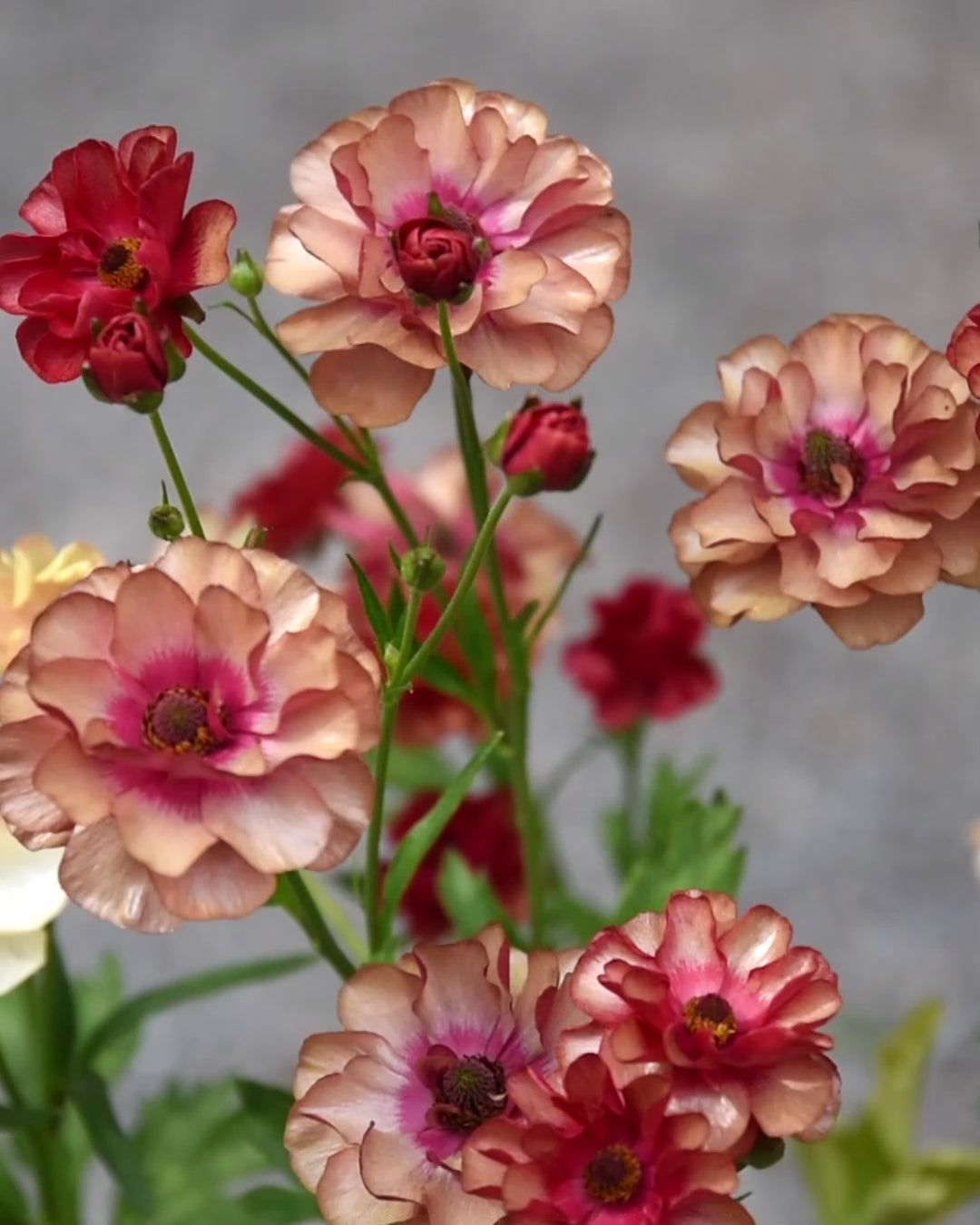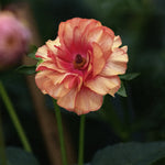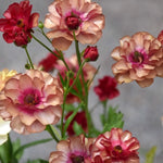 Fjärilsranunkel 'Butterfly Musa'®, Ranunculus 'Butterfly Musa'®. De fluffiga kronbladen har vackra, rosarostiga toner som blir något ljusare ju mer blommorna blommar. Ögat i mitten av blomman börjar som gult och mörknar sedan. Blombladen har ett litet lager av vax som ger dem ett gnistrande utseende och är därför perfekt som snittblomma.