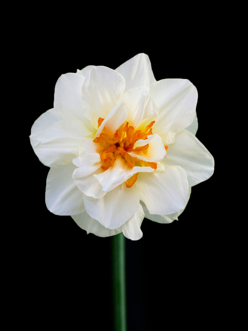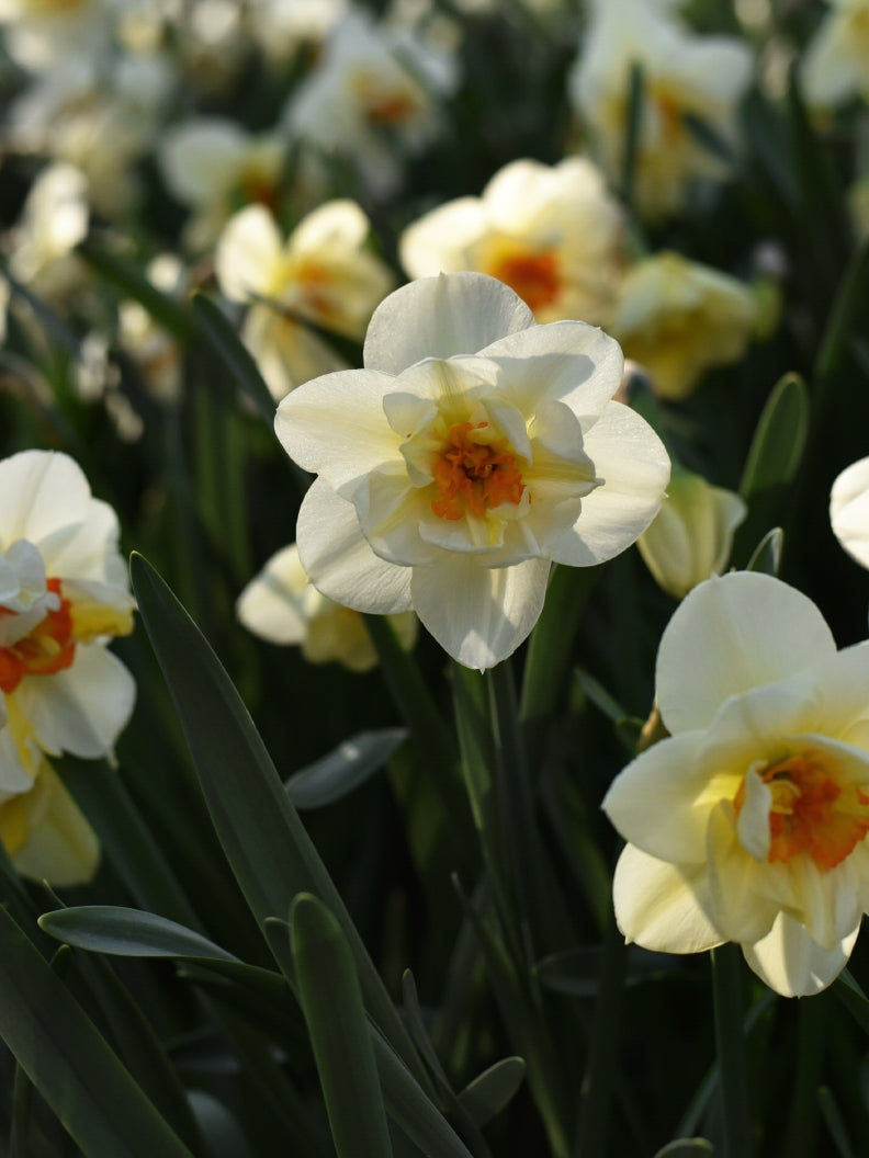 En starkt doftande dubbel narciss med krämvita kronblad som omsluter ett center i varma orangegula toner. Blommorna påminner nästan om pioner i sitt uttryck och ger ett romantiskt inslag i både rabatt och bukett. ’Flower Drift’ har stabila stjälkar, blommar i april–maj och blir cirka 40 cm hög. Utmärkt även som snittblomma.