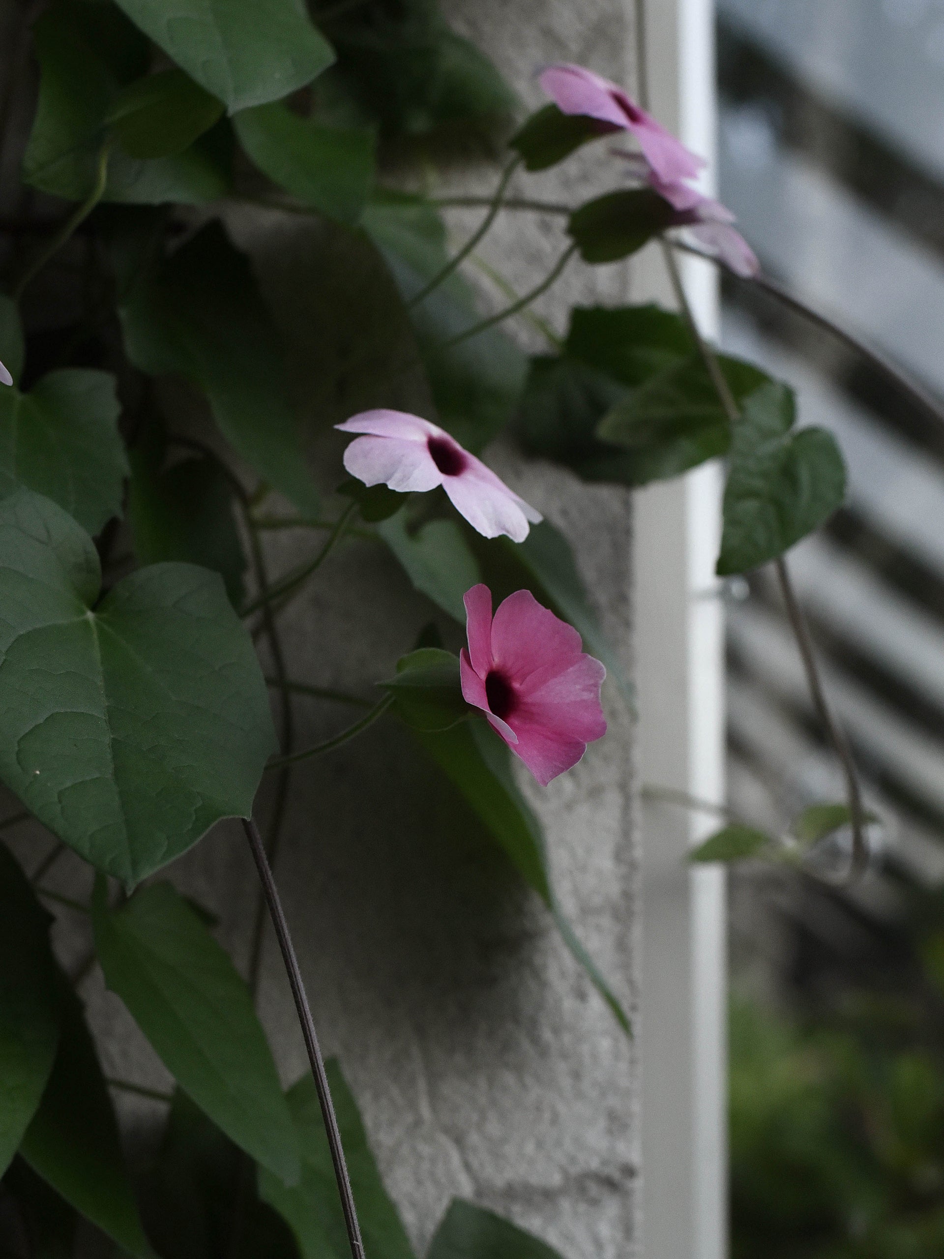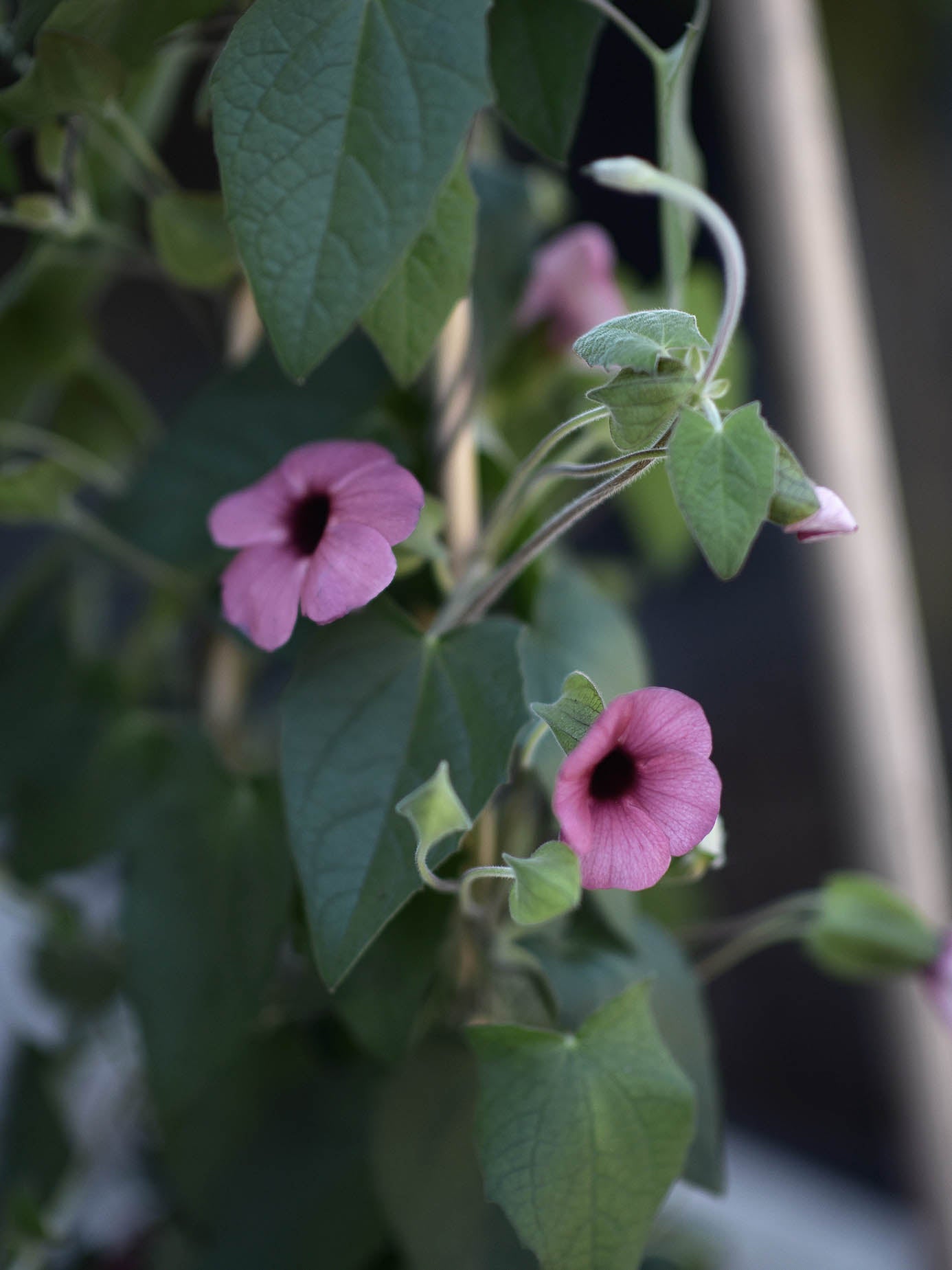 Rosa svartöga är en ettårig snabbväxande klätterväxt. Blommar till och med hösten med små rosa enkla blommor. Den klättrar snabbt och behöver stöd i form av spaljé eller trådar.