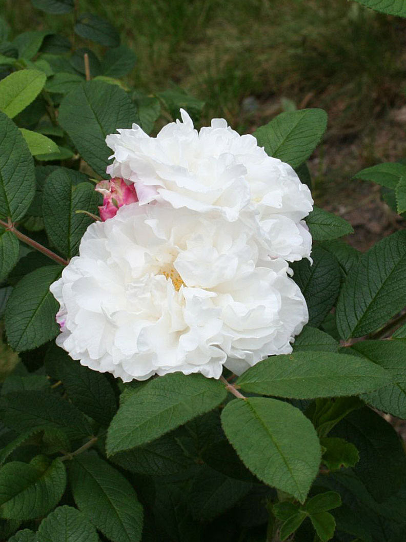 Blommor: Blomknopparna är gräddvita med rödrosa anstrykningar. Blommorna är medelstora och fyllda. Vita, ibland med rosa anstrykningar. Underbart stark och söt doft. Blommar nästan oavbrutet från slutet av juni till långt ut på hösten. Ornageröda nypon.