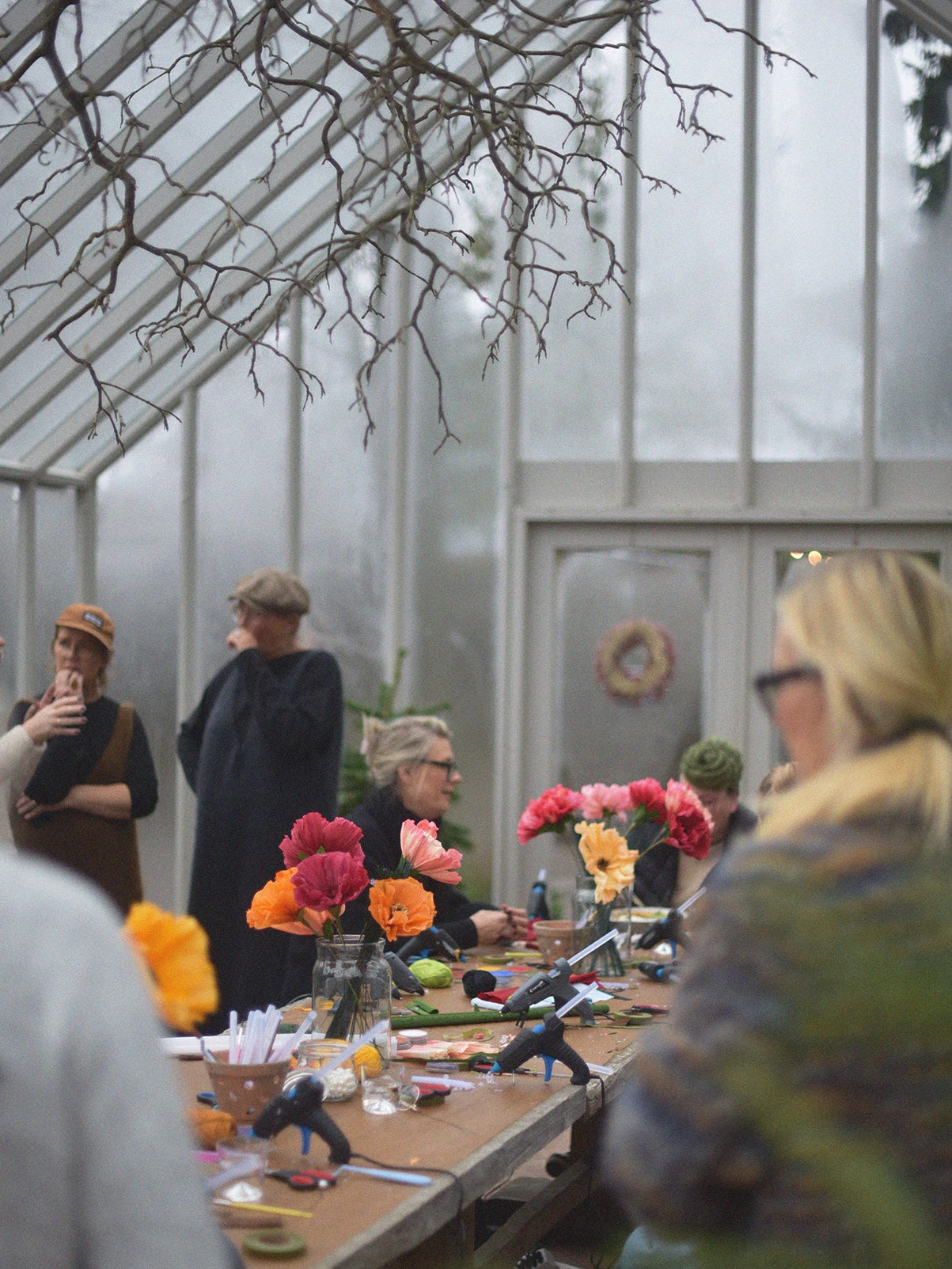Förra årets mysigaste växthushäng är tillbaka! Ida Englund och Karin Arbin från Firma Fanfar bjuder in till en inspirerande workshop där du får möjlighet att skapa din egen färgsprakande bukett – av pappersblommor. Vi tänder brasan i växthuset, sippar te och äter goda bakverk medan kreativiteten tar form. Med ett generöst urval av material får du vägledning att skapa dina egna unika pappersblommor – helt utan förkunskaper.